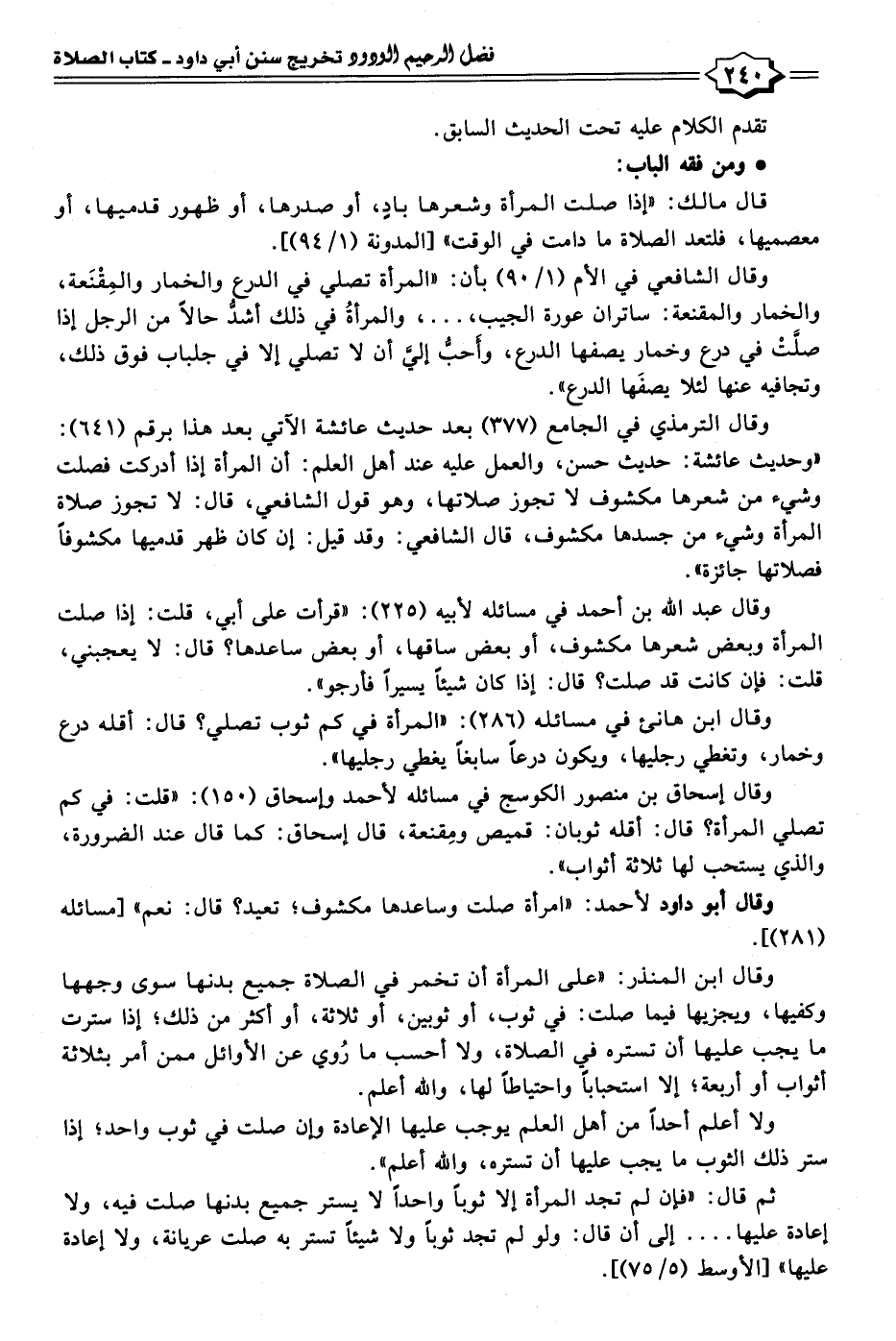 وقال الترمذي في الجامع (٣٧٧) بعد حديث عائشة الآتي بعد هذا برقم (٦٤١): "وحديث عائشة: حديث حسن، والعمل عليه عند أهل العلم: أن المرأة إذا أدركت فصلت وشيء من شعرها مكشوف لا تجوز صلاتها، وهو قول الشافعي، قال: لا تجوز صلاة المرأة وشيء من جسدها مكشوف، قال الشافعي: وقد قيل: إن كان ظهر قدميها مكشوفًا فصلاتها جائزة".