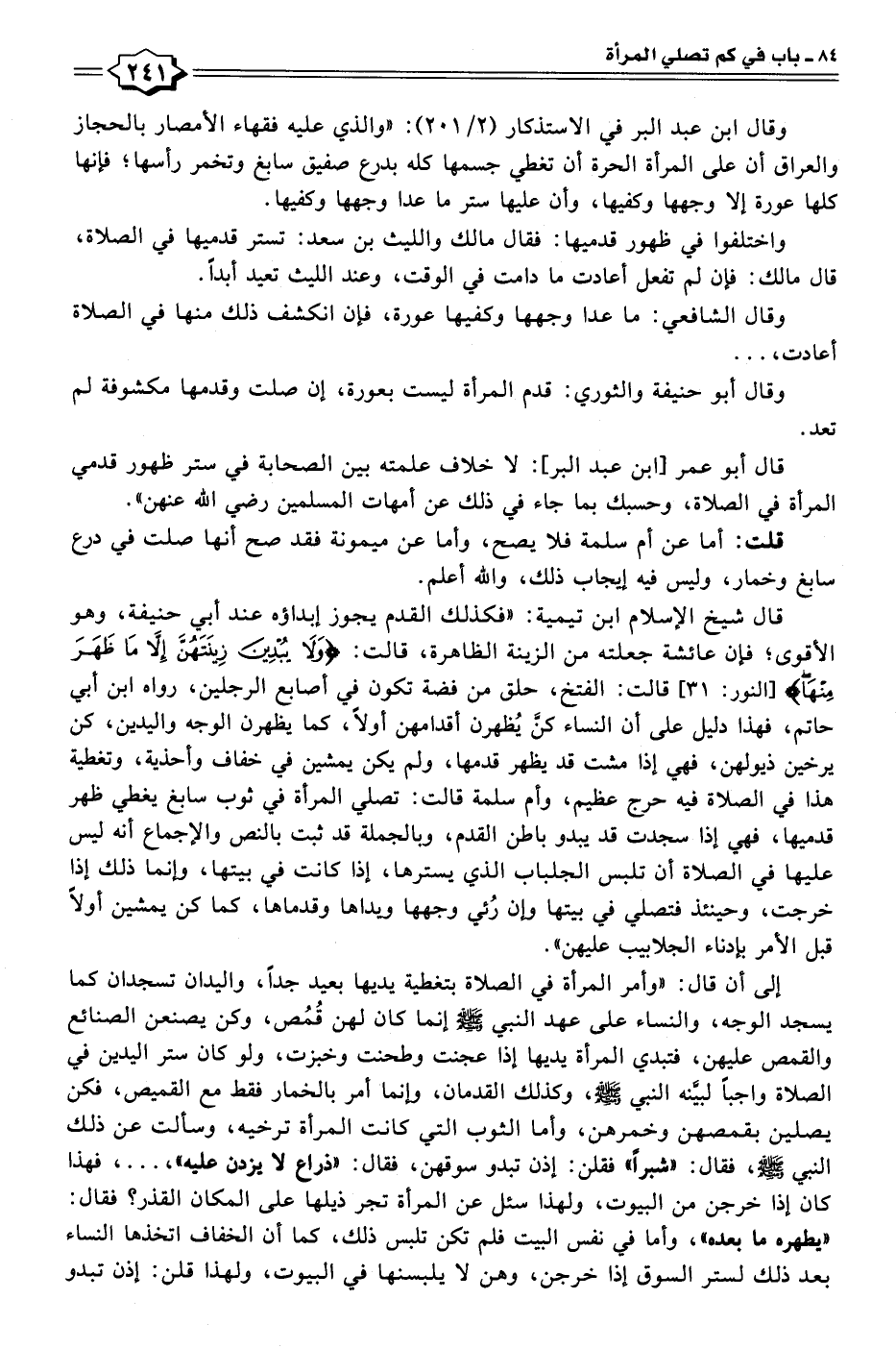 قال أبو عمر [ابن عبد البر]: لا خلاف علمته بين الصحابة في ستر ظهور قدمي المرأة في الصلاة، وحسبك بما جاء في ذلك عن أمهات المسلمين رضي الله عنهن".