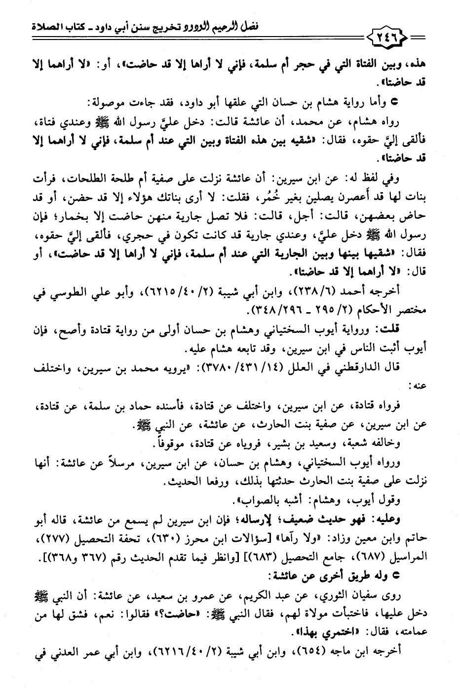 وفي لفظ له: عن ابن سيرين: أن عائشة نزلت على صفية أم طلحة الطلحات، فرأت بنات لها قد أَعصرن يصلين بغير خُمُر، فقلت: لا أرى بناتك هؤلاء إلا قد حضن، أو قد حاض بعضهن، قالت: أجل، قالت: فلا تصل جارية منهن حاضت إلا بخمار؛ فإن رسول الله - صلى الله عليه وسلم - دخل عليَّ، وعندي جارية قد كانت تكون في حجري، فألقى إليَّ حقوه، فقال: "شقيها بينها وبين الجارية التي عند أم سلمة، فإني لا أراها إلا قد حاضت"، أو قال: "لا أراهما إلا قد حاضتا".