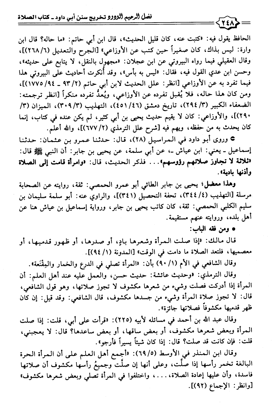 • وروى أبو داود في المراسيل (٢٨)، قال: حدثنا عمرو بن عثمان: حدثنا إسماعيل -يعني: ابن عياش-، عن أبي سلمة، عن يحيى بن جابر: أن النبي - صلى الله عليه وسلم - قال: "ثلاثة لا تجاوز صلاتهم رؤوسهم" ... فذكر الحديث، قال: "وامرأة قامت إلى الصلاة وأذنها بادية".