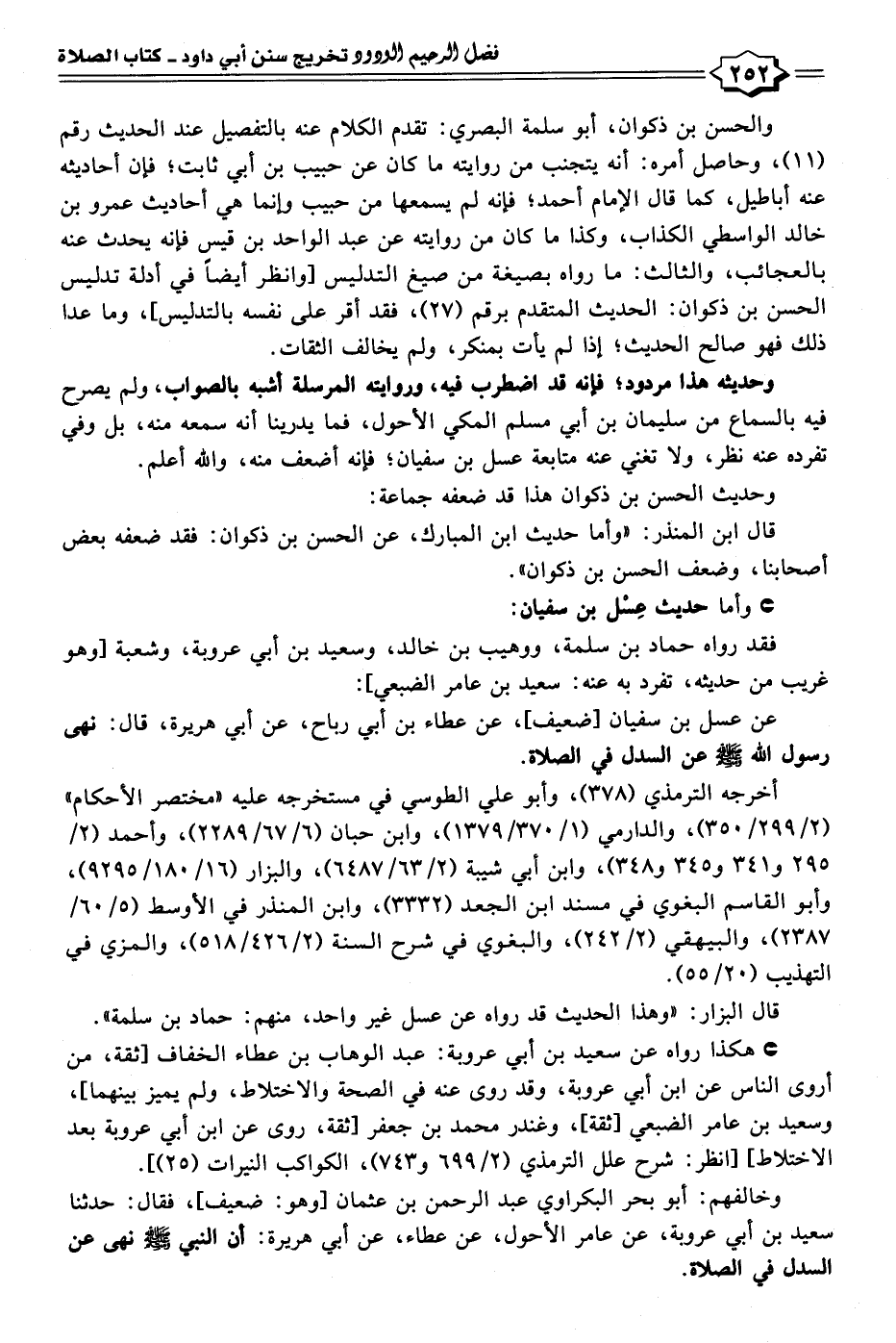 عن عسل بن سفيان [ضعيف]، عن عطاء بن أبي رباح، عن أبي هريرة، قال: نهى رسول الله - صلى الله عليه وسلم - عن السدل في الصلاة.