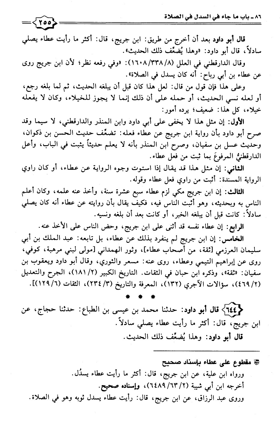 قال أبو داود بعد أن أخرج من طريق: ابن جريج، قال: أكثر ما رأيت عطاء يصلي سادلًا، قال أبو داود: "وهذا يُضعِّف ذلك الحديث".