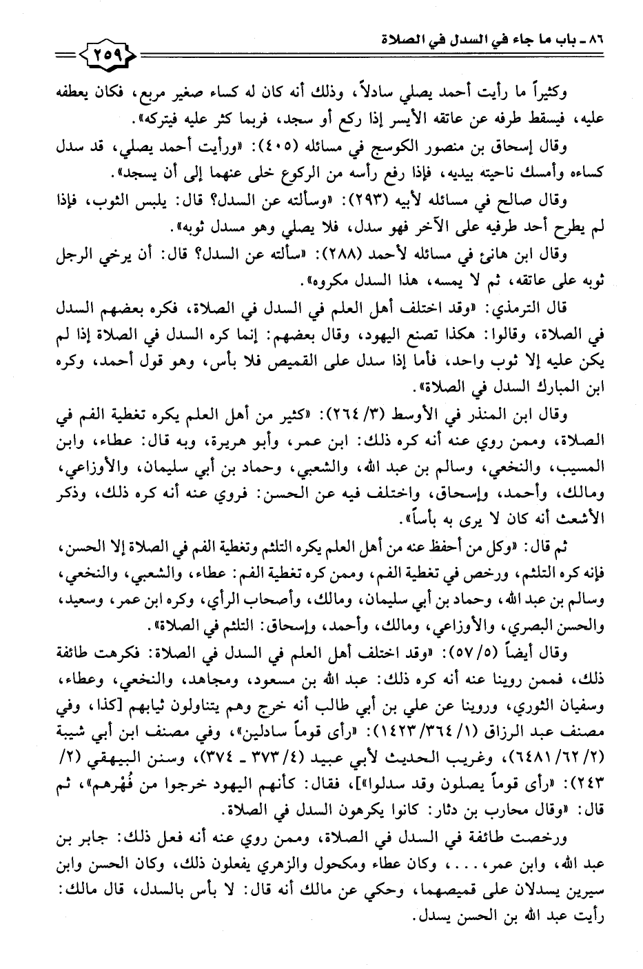 قال الترمذي: "وقد اختلف أهل العلم في السدل في الصلاة، فكره بعضهم السدل في الصلاة، وقالوا: هكذا تصنع اليهود، وقال بعضهم: إنما كره السدل في الصلاة إذا لم يكن عليه إلا ثوب واحد، فأما إذا سدل على القميص فلا بأس، وهو قول أحمد، وكره ابن المبارك السدل في الصلاة".