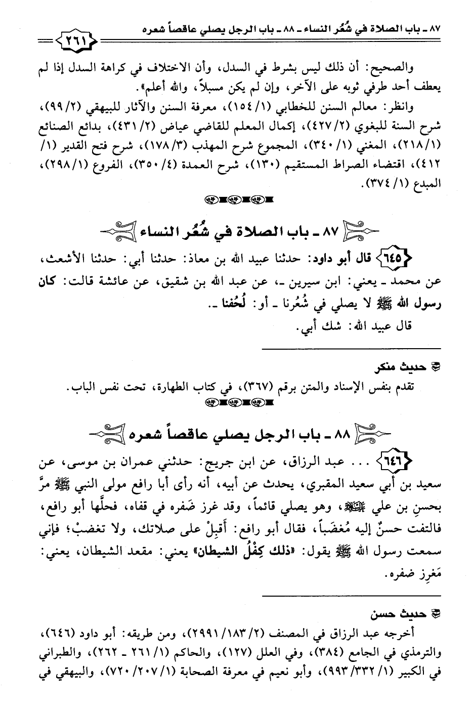٦٤٦ - . . . عبد الرزاق، عن ابن جريج: حدثني عمران بن موسى، عن سعيد بن أبي سعيد المقبري، يحدث عن أبيه، أنه رأى أبا رافع مولى النبي - صلى الله عليه وسلم - مرَّ بحسنِ بن علي عليه السلام، وهو يصلي قائمًا، وقد غرز ضَفره في قفاه، فحلَّها أبو رافع، فالتفت حسنٌ إليه مُغضَبًا، فقال أبو رافع: أَقبِلْ على صلاتك، ولا تغضبْ؛ فإني سمعت رسول الله - صلى الله عليه وسلم - يقول: "ذلك كِفْلُ الشيطان" يعني: مقعد الشيطان، يعني: مَغرِز ضفره.