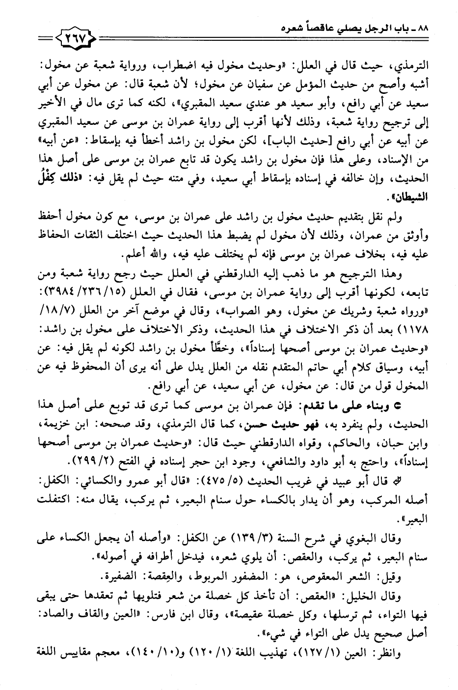 الترمذي، حيث قال في العلل: "وحديث مخول فيه اضطراب، ورواية شعبة عن مخول: أشبه وأصح من حديث المؤمل عن سفيان عن مخول؛ لأن شعبة قال: عن مخول عن أبي سعيد عن أبي رافع، وأبو سعيد هو عندي سعيد المقبري"، لكنه كما ترى مال في الأخير إلى ترجيح رواية شعبة، وذلك لأنها أقرب إلى رواية عمران بن موسى عن سعيد المقبري عن أبيه عن أبي رافع [حديث الباب]، لكن مخول بن راشد أخطأ فيه بإسقاط: "عن أبيه" من الإسناد، وعلى هذا فإن مخول بن راشد يكون قد تابع عمران بن موسى على أصل هذا الحديث، وإن خالفه في إسناده بإسقاط أبي سعيد، وفي متنه حيث لم يقل فيه: "ذلك كِفْلُ الشيطان".