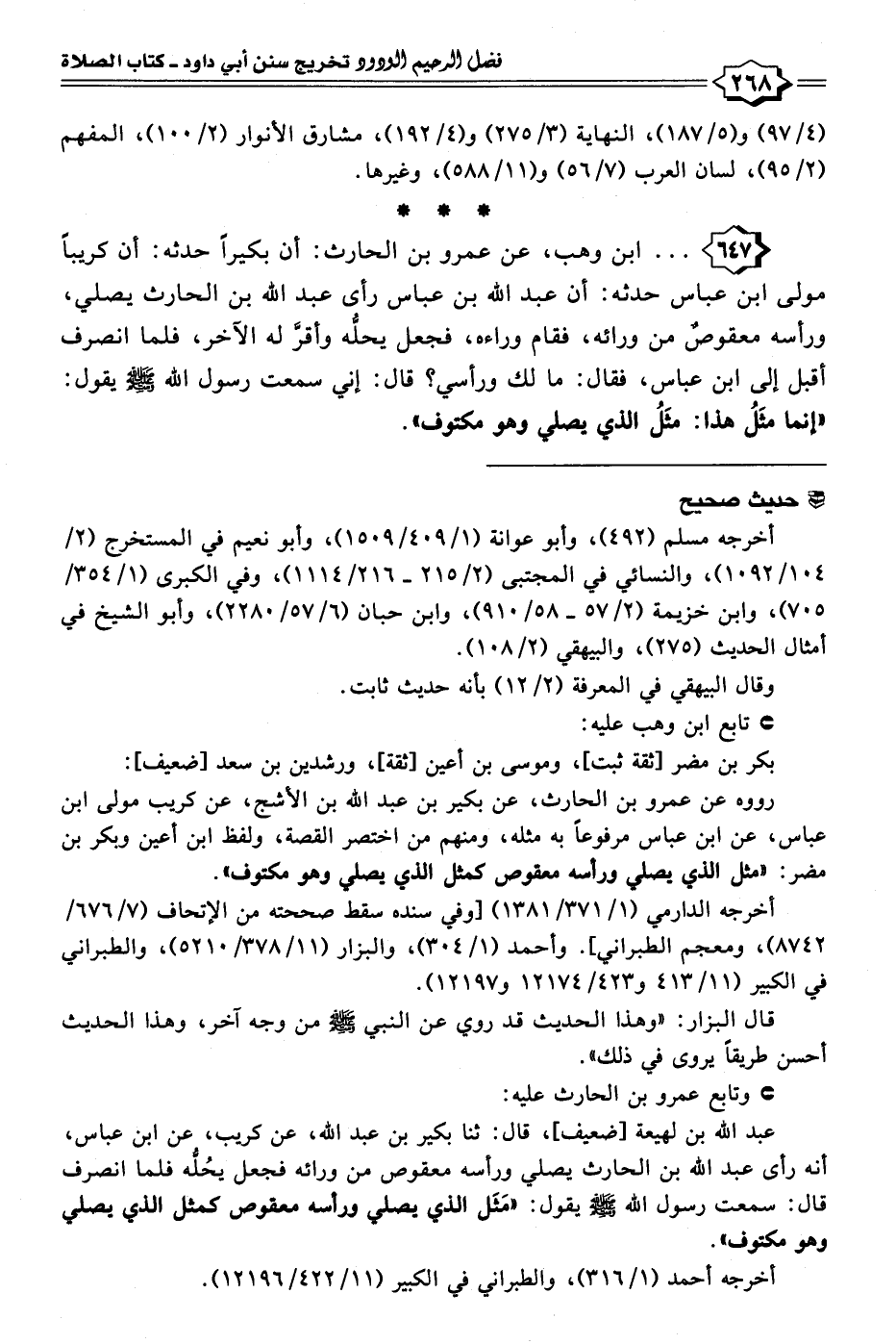 ٦٤٧ - . . . ابن وهب، عن عمرو بن الحارث: أن بكيرًا حدثه: أن كريبًا مولى ابن عباس حدثه: أن عبد الله بن عباس رأى عبد الله بن الحارث يصلي، ورأسه معقوصٌ من ورائه، فقام وراءه، فجعل يحلُّه وأقرَّ له الآخر، فلما انصرف أقبل إلى ابن عباس، فقال: ما لك ورأسي؟ قال: إني سمعت رسول الله - صلى الله عليه وسلم - يقول: "إنما مثَلُ هذا: مثَلُ الذي يصلي وهو مكتوف".