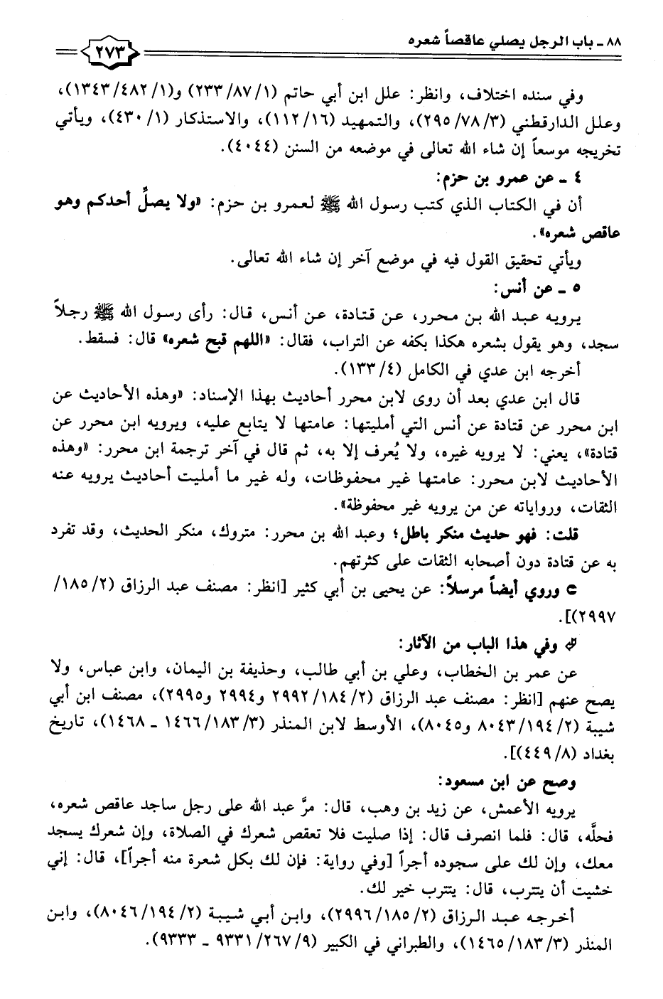 يرويه الأعمش، عن زيد بن وهب، قال: مرَّ عبد الله على رجل ساجد عاقص شعره، فحلَّه، قال: فلما انصرف قال: إذا صليت فلا تعقص شعرك في الصلاة، وإن شعرك يسجد معك، وإن لك على سجوده أجرًا [وفي رواية: فإن لك بكل شعرة منه أجرًا]، قال: إني خشيت أن يتترب، قال: يتترب خير لك.