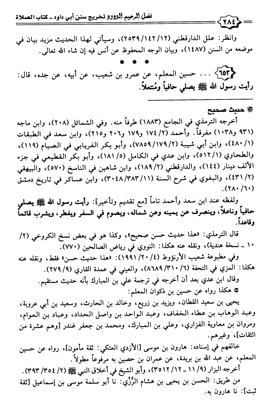 ٦٥٣ - . . . حسين المعلم، عن عمرو بن شعيب، عن أبيه، عن جده، قال: رأيت رسول الله - صلى الله عليه وسلم - يصلي حافيًا ومُنتعلًا.