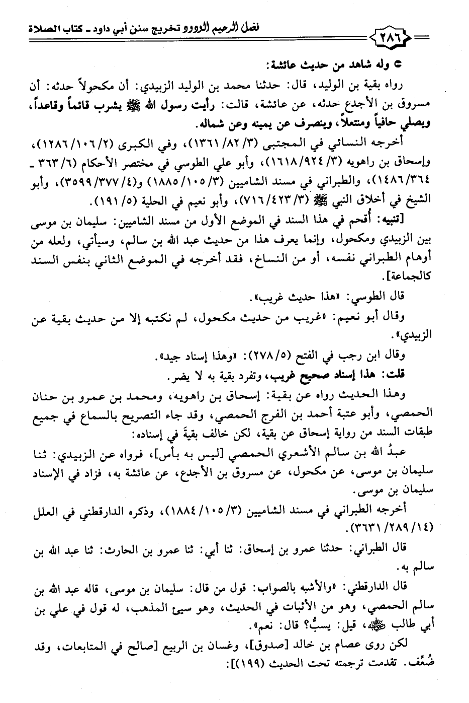 رواه بقية بن الوليد، قال: حدثنا محمد بن الوليد الزبيدي: أن مكحولًا حدثه: أن مسروق بن الأجدع حدثه، عن عائشة، قالت: رأيت رسول الله - صلى الله عليه وسلم - يشرب قائمًا وقاعدًا, ويصلي حافيًا ومنتعلًا ,وينصرف عن يمينه وعن شماله.