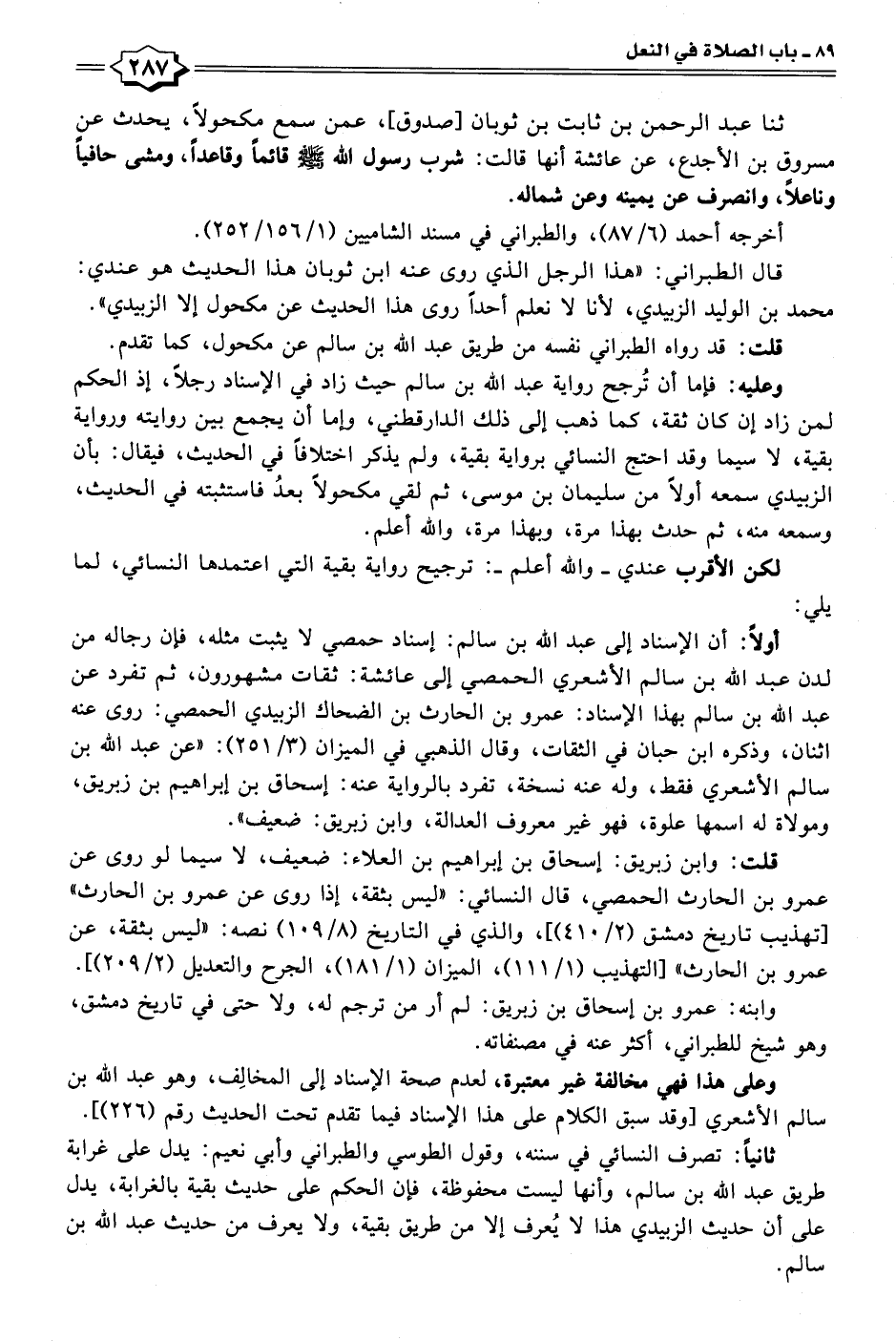 ثنا عبد الرحمن بن ثابت بن ثوبان [صدوق]، عمن سمع مكحولًا، يحدث عن مسروق بن الأجدع، عن عائشة أنها قالت: شرب رسول الله - صلى الله عليه وسلم - قائمًا وقاعدًا، ومشى حافيًا وناعلًا، وانصرف عن يمينه وعن شماله.