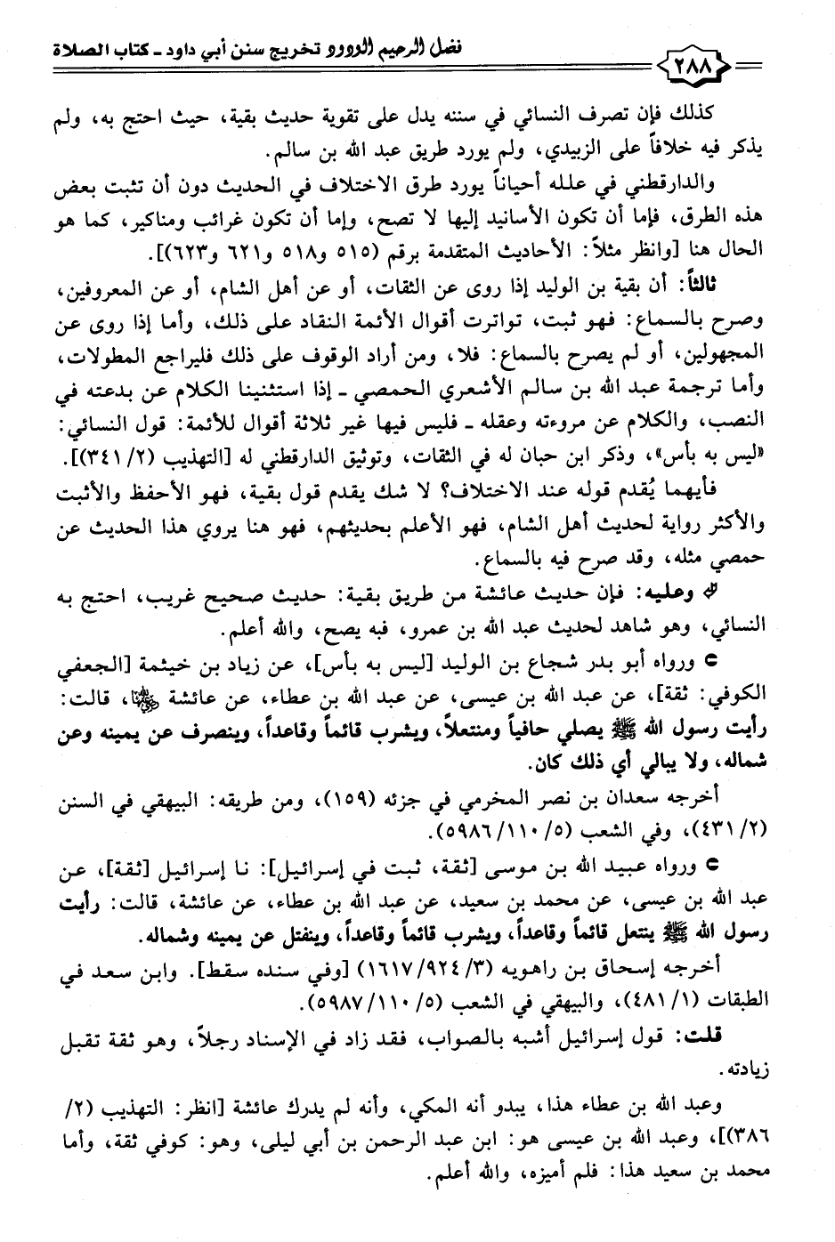 • ورواه أبو بدر شجاع بن الوليد [ليس به بأس]، عن زياد بن خيثمة [الجعفي الكوفي: ثقة]، عن عبد الله بن عيسى، عن عبد الله بن عطاء، عن عائشة - رضي الله عنها -، قالت: رأيت رسول الله - صلى الله عليه وسلم - يصلي حافيًا ومنتعلًا، ويشرب قائمًا وقاعدًا، وينصرف عن يمينه وعن شماله، ولا يبالي أي ذلك كان.