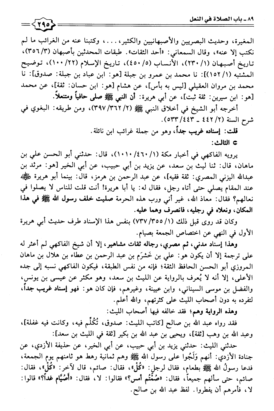 المغيرة، وحديث البصريين والأصبهانيين والكثير، ... ، وكتبنا عنه من الغرائب ما لم نكتب إلا عنه"، وقال السمعاني: "أحد الثقات". طبقات المحدثين بأصبهان (٣/ ٣٥٦)، تاريخ أصبهان (١/ ٢٣٠)، الأنساب (٥/ ٤٥٠)، تاريخ الإسلام (٢٢/ ١٠٠)، توضيح المشتبه (١/ ١٥٢)]: نا محمد بن عمرو بن جبلة [هو: ابن عباد بن جبلة: صدوق]: نا محمد بن مروان العقيلي [ليس به بأس]، عن هشام [هو: ابن حسان: ثقة]، عن محمد [هو: ابن سيرين: ثقة ثبت]، عن أبي هريرة: أن النبي - صلى الله عليه وسلم - صلى حافيًا ومتنعلًا.