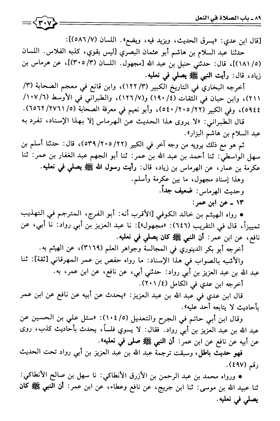 • رواه الهيثم بن خالد الكوفي [الأقرب أنه: أبو الفرج، المترجم في التهذيب تمييزًا، قال في التقريب (٦٤٦): "مجهول"]: نا عبد العزيز بن أبي رواد: نا أبي، عن نافع، عن ابن عمر: أن النبي - صلى الله عليه وسلم - كان يصلي في نعليه.