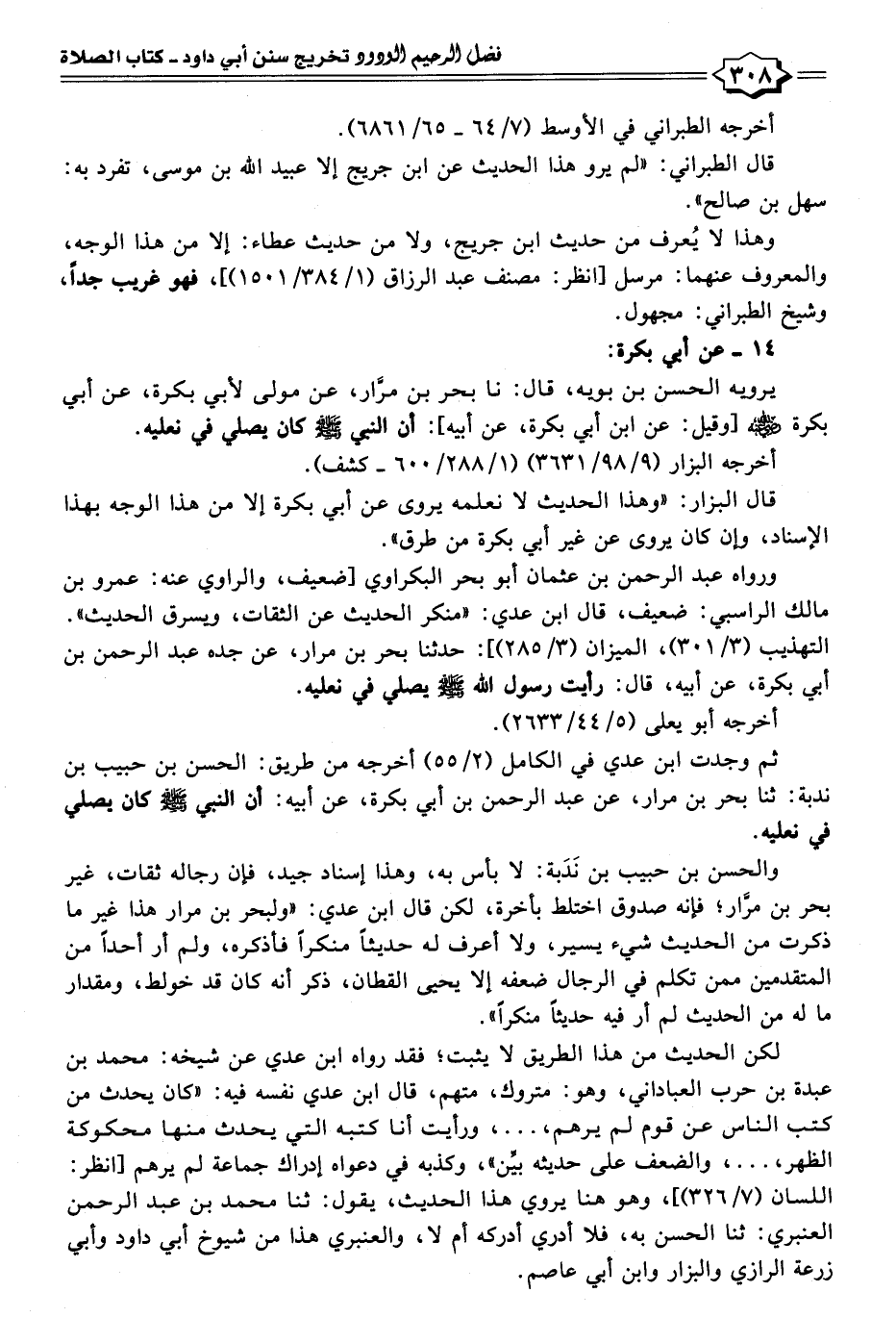 التهذيب (٣/ ٣٠١)، الميزان (٣/ ٢٨٥)]: حدثنا بحر بن مرار، عن جده عبد الرحمن بن أبي بكرة، عن أبيه، قال: رأيت رسول الله - صلى الله عليه وسلم - يصلي في نعليه.