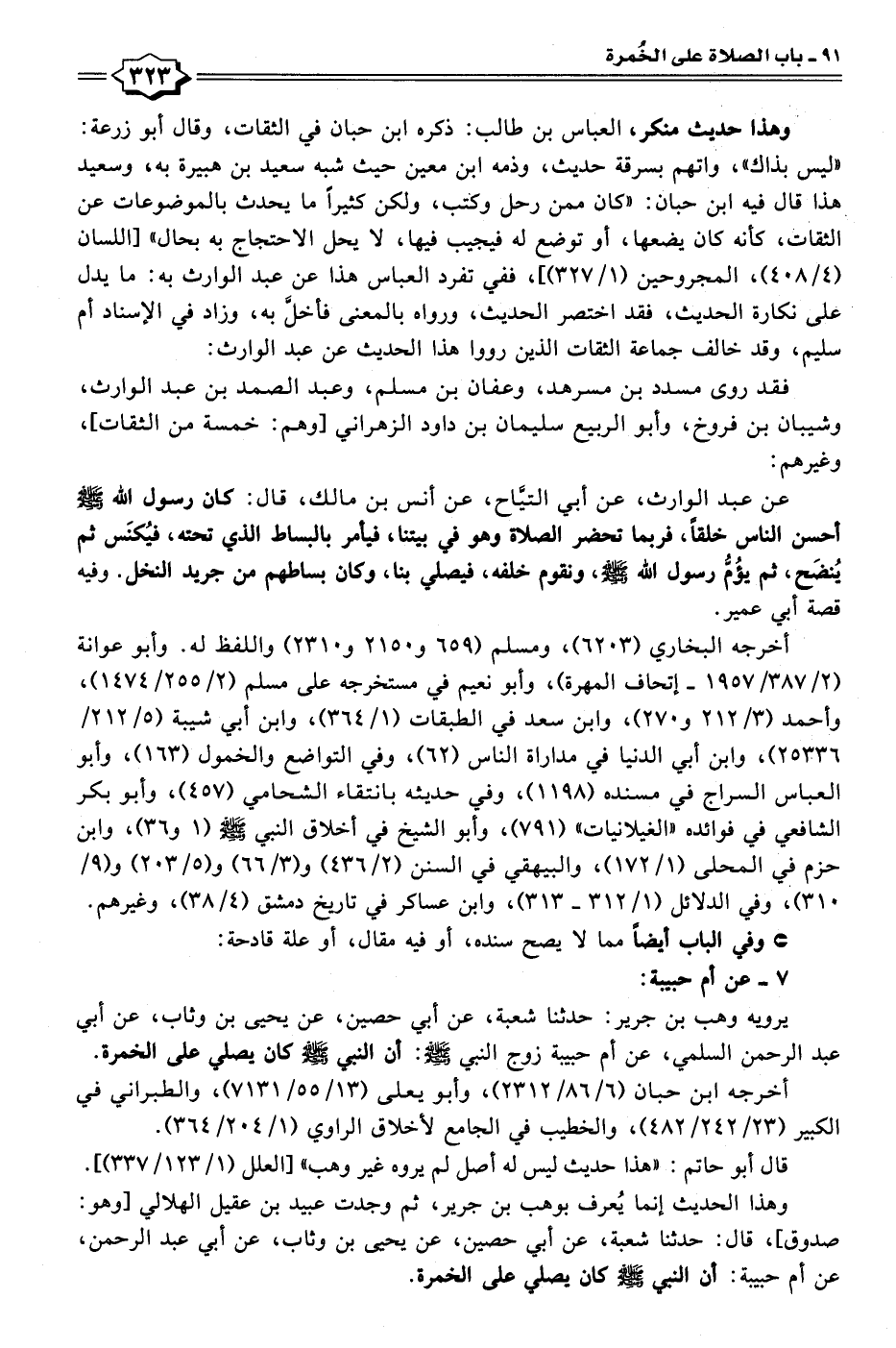وهذا الحديث إنما يُعرف بوهب بن جرير، ثم وجدت عبيد بن عقيل الهلالي [وهو: صدوق]، قال: حدثنا شعبة، عن أبي حصين، عن يحيى بن وثاب، عن أبي عبد الرحمن، عن أم حبيبة: أن النبي - صلى الله عليه وسلم - كان يصلي على الخمرة.