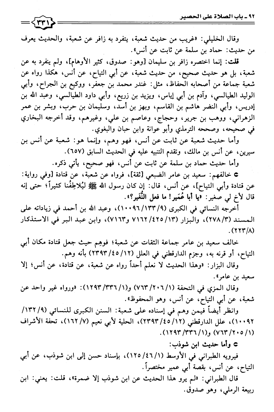 • خالفهم: سعيد بن عامر الضبعي [ثقة]، فرواه عن شعبة، عن قتادة [وفي رواية: عن قتادة وأبي التياح]، عن أنس، قال: إن كان رسول الله - صلى الله عليه وسلم - ليُلاطِفُنا كثيرًا؛ حتى إنه قال لأخ لي صغير: "يا أبا عُمَير! ما فعل النُّغَير؟ ".