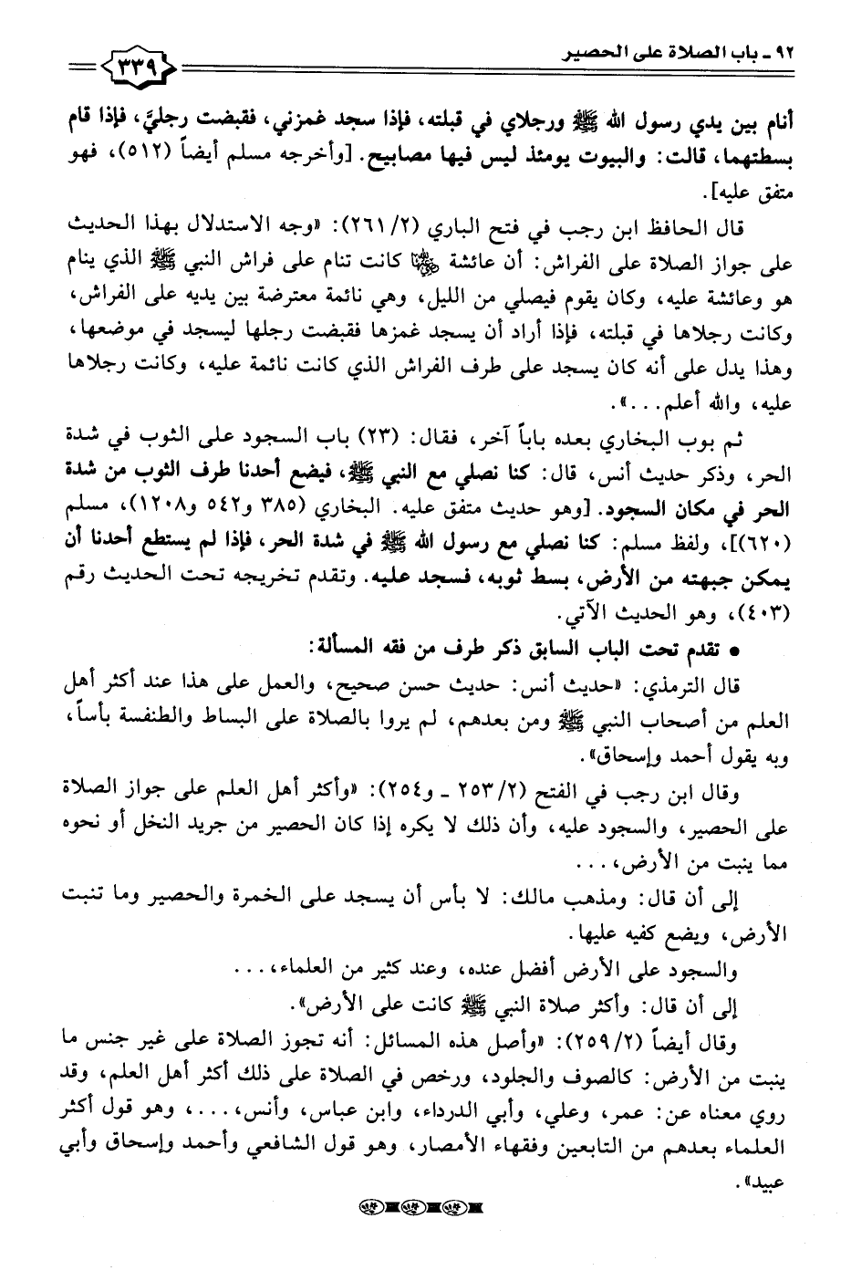وقال ابن رجب في الفتح (٢/ ٢٥٣ - و ٢٥٤): "وأكثر أهل العلم على جواز الصلاة على الحصير، والسجود عليه، وأن ذلك لا يكره إذا كان الحصير من جريد النخل أو نحوه مما ينبت من الأرض، ...