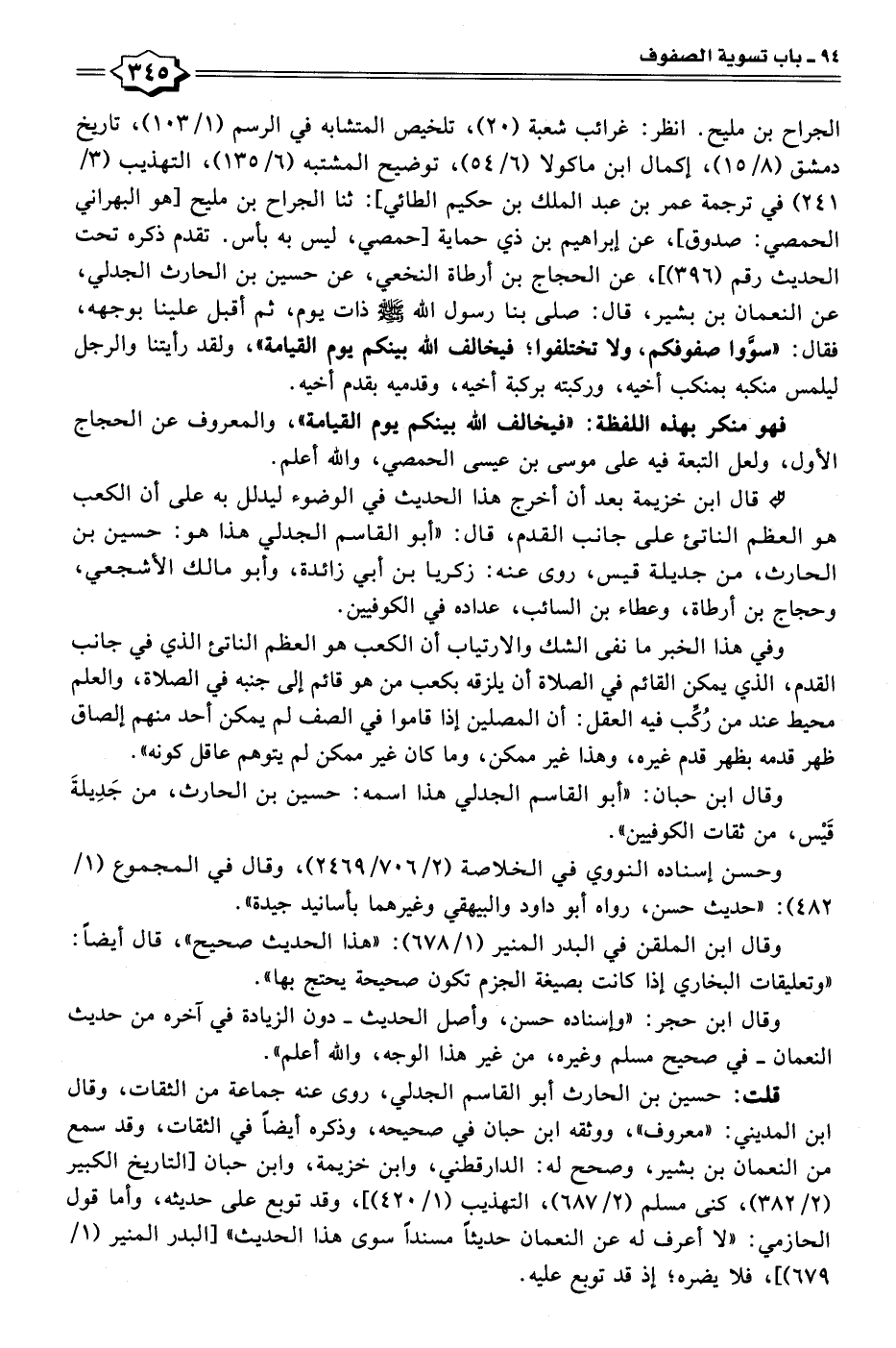الجراح بن مليح. انظر: غرائب شعبة (٢٠)، تلخيص المتشابه في الرسم (١/ ١٠٣)، تاريخ دمشق (٨/ ١٥)، إكمال ابن ماكولا (٦/ ٥٤)، توضيح المشتبه (٦/ ١٣٥)، التهذيب (٣/ ٢٤١) في ترجمة عمر بن عبد الملك بن حكيم الطائي]: ثنا الجراح بن مليح [هو البهراني الحمصي: صدوق]، عن إبراهيم بن ذي حماية [حمصي، ليس به بأس. تقدم ذكره تحت الحديث رقم (٣٩٦)]، عن الحجاج بن أرطاة النخعي، عن حسين بن الحارث الجدلي، عن النعمان بن بشير، قال: صلى بنا رسول الله - صلى الله عليه وسلم - ذات يوم، ثم أقبل علينا بوجهه، فقال: "سوَّوا صفوفكم، ولا تختلفوا؛ فيخالف الله بينكم يوم القيامة"، ولقد رأيتنا والرجل ليلمس منكبه بمنكب أخيه، وركبته بركبة أخيه، وقدميه بقدم أخيه.