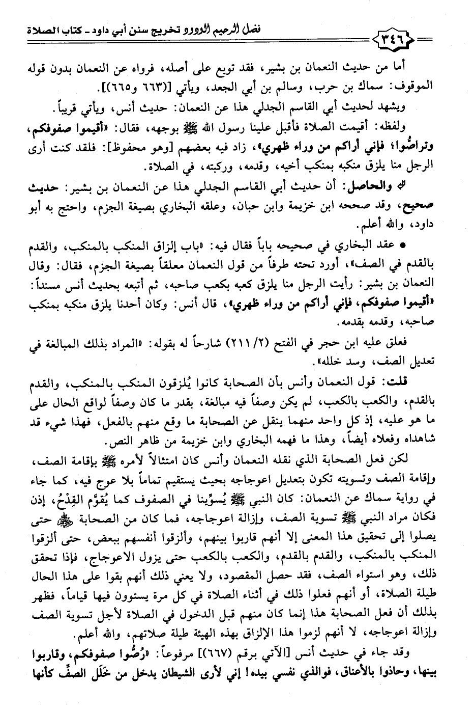 قلت: قول النعمان وأنس بأن الصحابة كانوا يُلزقون المنكب بالمنكب، والقدم بالقدم، والكعب بالكعب، لم يكن وصفًا فيه مبالغة، بقدر ما كان وصفًا لواقع الحال على ما هو عليه، إذ كل واحد منهما ينقل عن الصحابة ما وقع منهم بالفعل، فهذا شيء قد شاهداه وفعلاه أيضًا، وهذا ما فهمه البخاري وابن خزيمة من ظاهر النص.