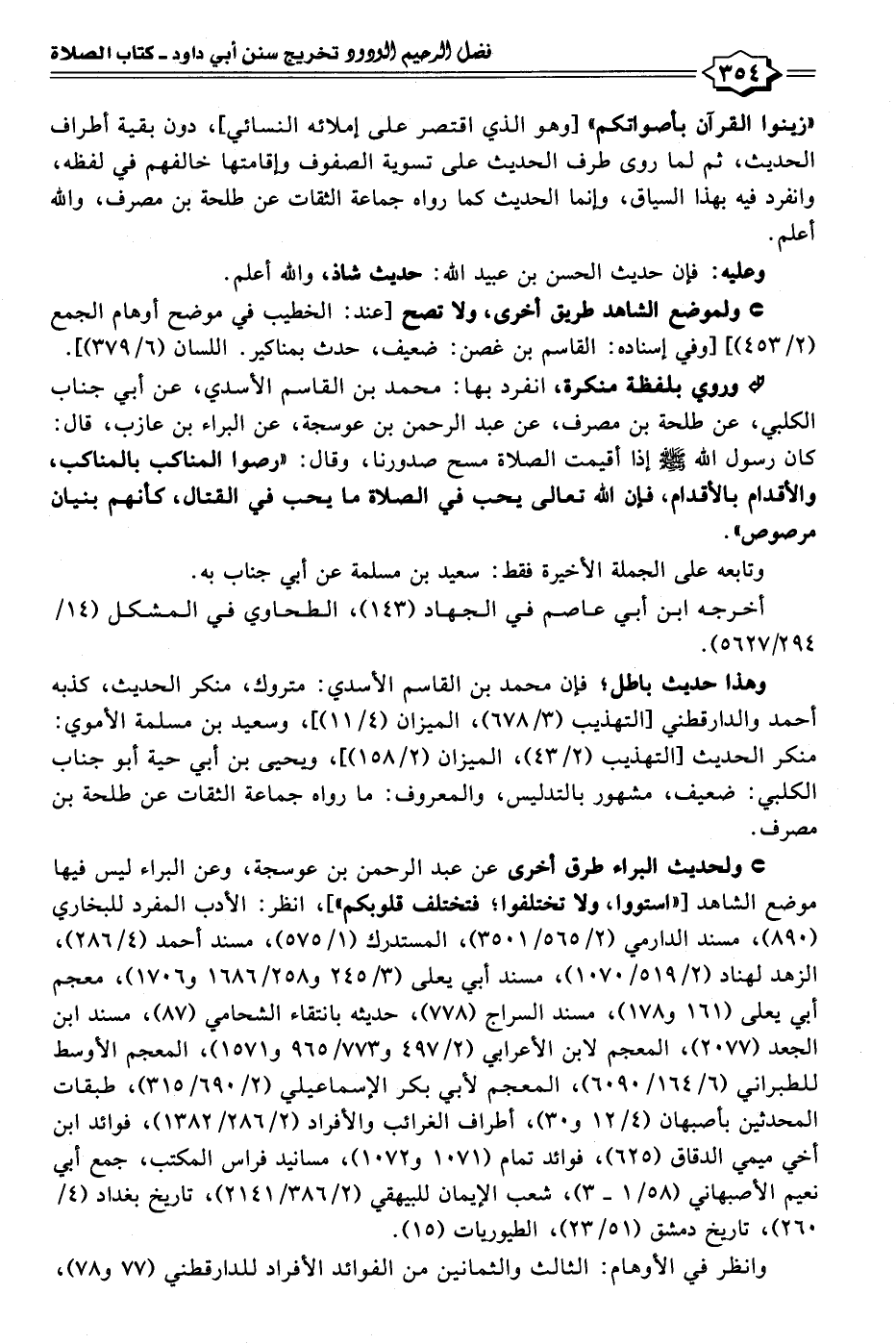 "زينوا القرآن بأصواتكم" [وهو الذي اقتصر على إملائه النسائي]، دون بقية أطراف الحديث، ثم لما روى طرف الحديث على تسوية الصفوف وإقامتها خالفهم في لفظه، وانفرد فيه بهذا السياق، وإنما الحديث كما رواه جماعة الثقات عن طلحة بن مصرف، والله أعلم.