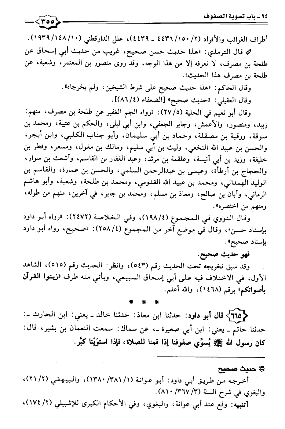 ٦٦٥ - قال أبو داود: حدثنا ابن معاذ: حدثنا خالد -يعني: ابن الحارث-: حدثنا حاتم -يعني: ابن أبي صغيرة-، عن سماك: سمعت النعمان بن بشير، قال: كان رسول الله - صلى الله عليه وسلم - يُسوِّي صفوفنا إذا قمنا للصلاة، فإذا استوَيْنا كبَّر.