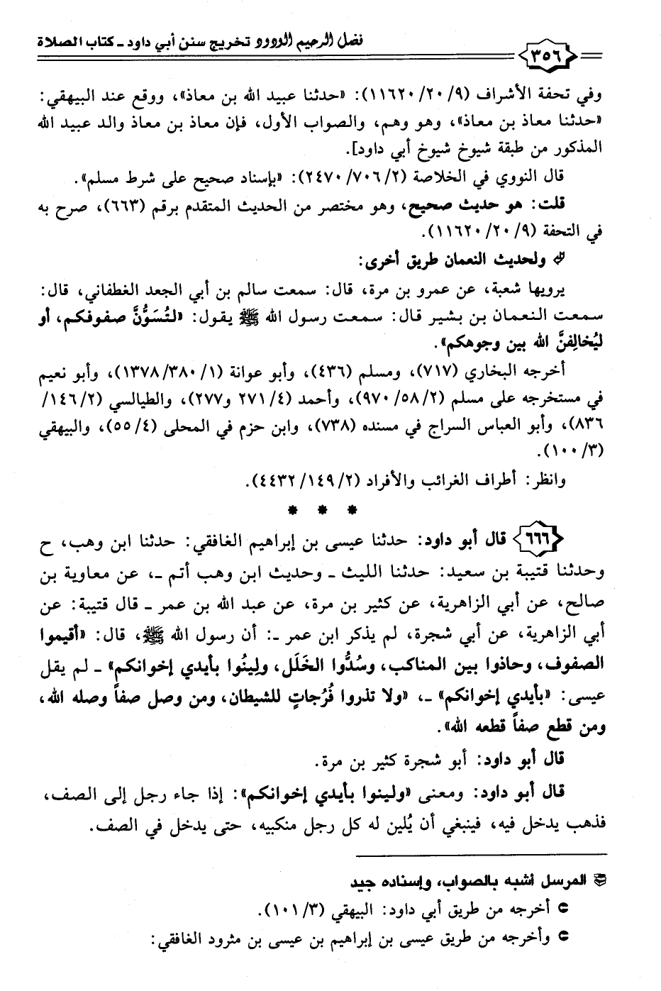 ٦٦٦ - قال أبو داود: حدثنا عيسى بن إبراهيم الغافقي: حدثنا ابن وهب، ح وحدثنا قتيبة بن سعيد: حدثنا الليث -وحديث ابن وهب أتم-، عن معاوية بن صالح، عن أبي الزاهرية، عن كثير بن مرة، عن عبد الله بن عمر -قال قتيبة: عن أبي الزاهرية، عن أبي شجرة، لم يذكر ابن عمر-: أن رسول الله - صلى الله عليه وسلم -، قال: "أقيموا الصفوف، وحاذوا بين المناكب، وسُدُّوا الخَلَل، ولِينُوا بأيدي إخوانكم" -لم يقل عيسى: "بأيدي إخوانكم"-، "ولا تذروا فُرُجاتٍ للشيطان، ومن وصل صفًا وصله الله، ومن قطع صفًا قطعه الله".