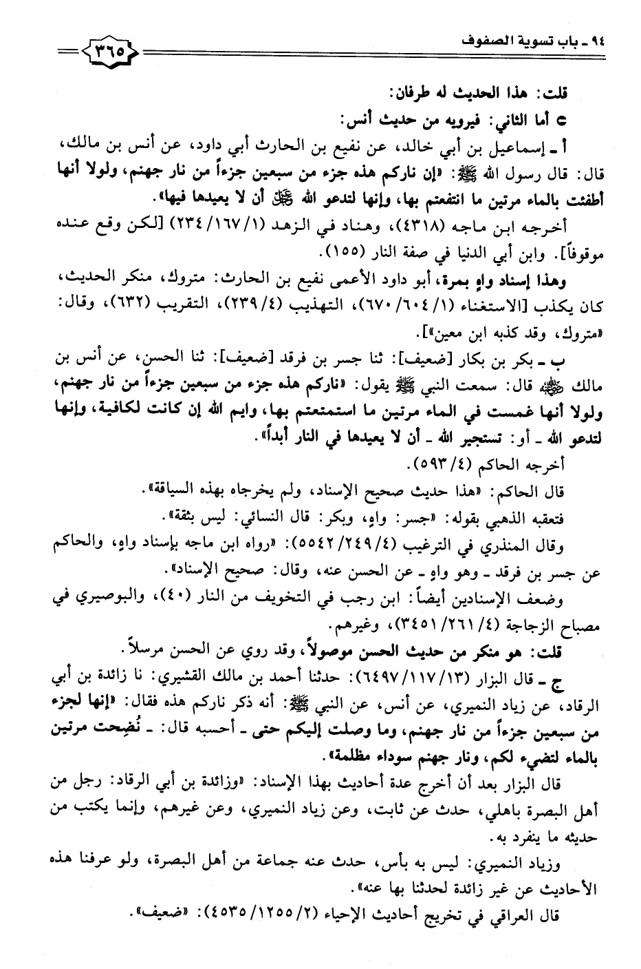 ج- قال البزار (١٣/ ١١٧ / ٦٤٩٧): حدثنا أحمد بن مالك القشيري: نا زائدة بن أبي الرقاد، عن زياد النميري، عن أنس، عن النبي - صلى الله عليه وسلم -: أنه ذكر ناركم هذه فقال: "إنها لجزء من سبعين جزءًا من نار جهنم، وما وصلت إليكم حتى -أحسبه قال:- نُضِحت مرتين بالماء لتضيء لكم، ونار جهنم سوداء مظلمة".