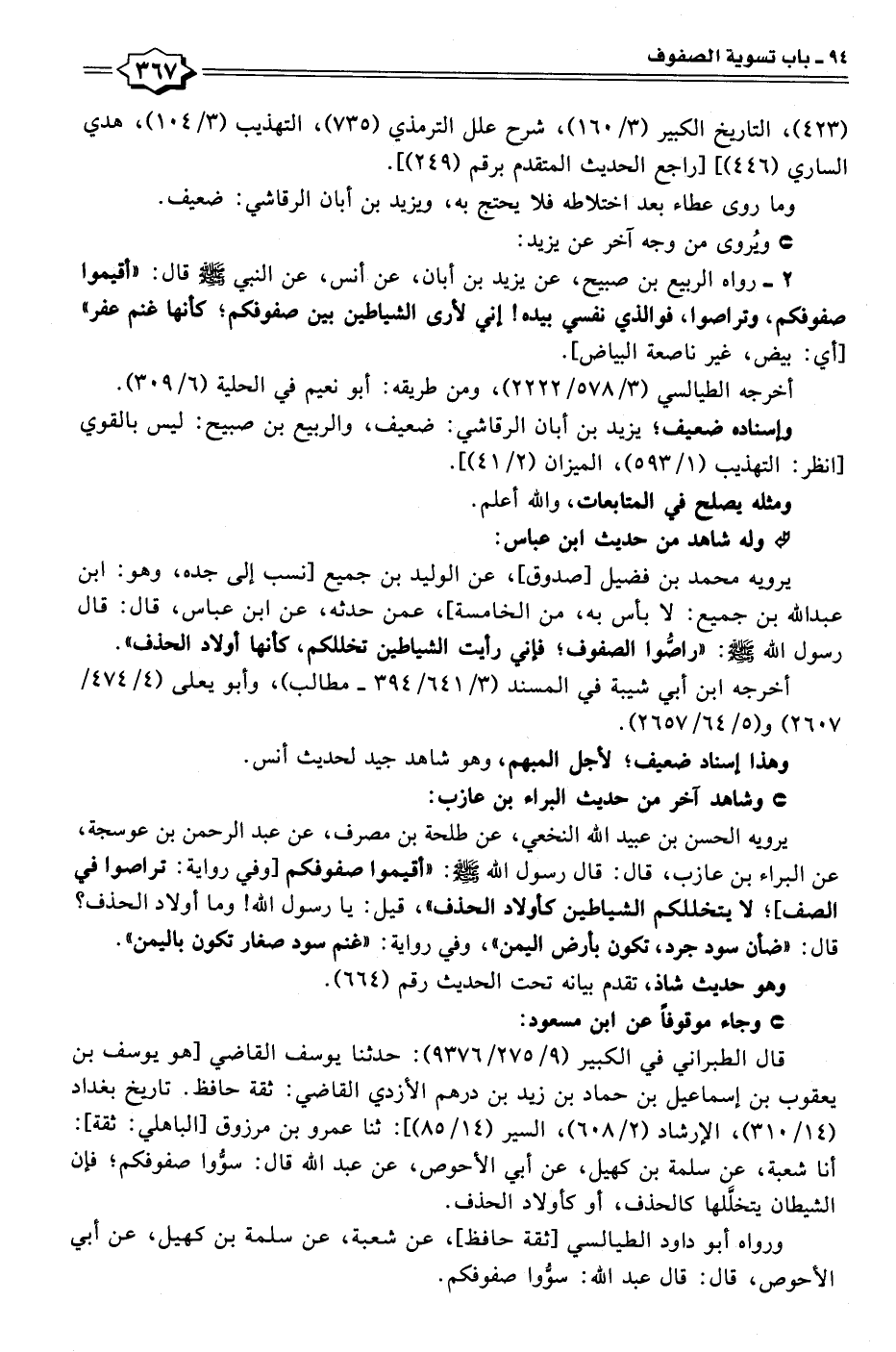 قال الطبراني في الكبير (٩/ ٢٧٥/ ٩٣٧٦): حدثنا يوسف القاضي [هو يوسف بن يعقوب بن إسماعيل بن حماد بن زيد بن درهم الأزدي القاضي: ثقة حافظ. تاريخ بغداد (١٤/ ٣١٠)، الإرشاد (٢/ ٦٠٨)، السير (١٤/ ٨٥)]: ثنا عمرو بن مرزوق [الباهلي: ثقة]: أنا شعبة، عن سلمة بن كهيل، عن أبي الأحوص، عن عبد الله قال: سوُّوا صفوفكم؛ فإن الشيطان يتخلَّلها كالحذف، أو كأولاد الحذف.