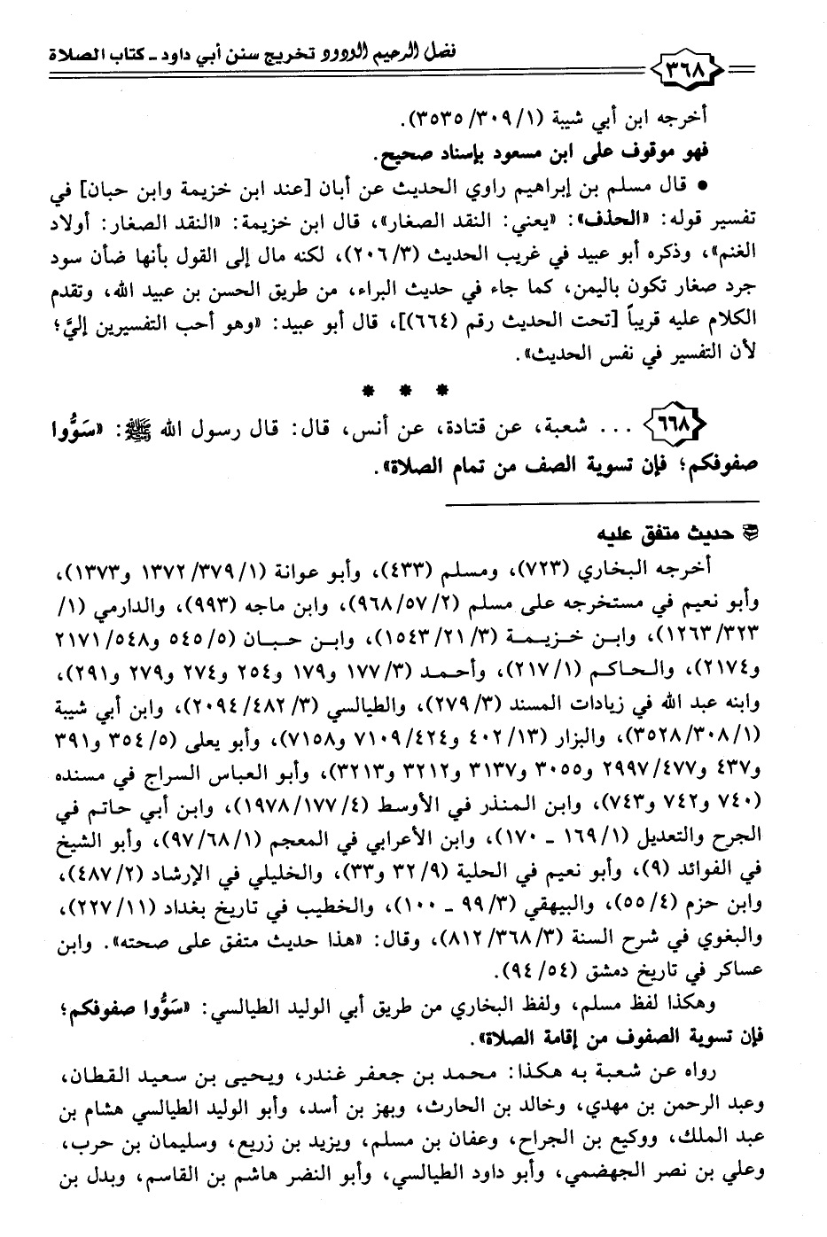 ٦٦٨ - . . . شعبة، عن قتادة، عن أنس، قال: قال رسول الله - صلى الله عليه وسلم -: "سَوُّوا صفوفكم؛ فإن تسوية الصف من تمام الصلاة".