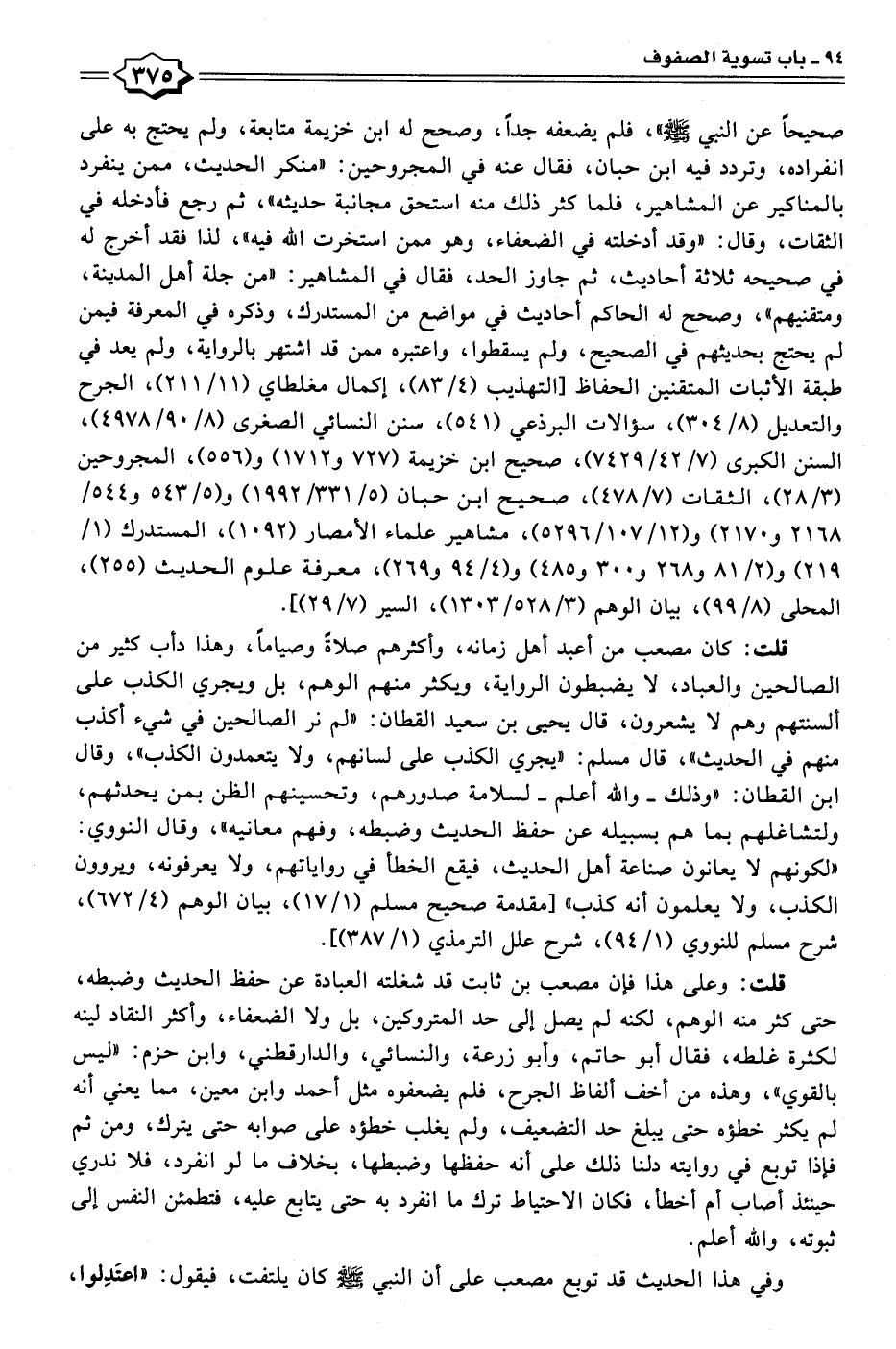 قلت: كان مصعب من أعبد أهل زمانه، وأكثرهم صلاةً وصيامًا، وهذا دأب كثير من الصالحين والعباد، لا يضبطون الرواية، ويكثر منهم الوهم، بل ويجري الكذب على ألسنتهم وهم لا يشعرون، قال يحيى بن سعيد القطان: "لم نر الصالحين في شيء أكذب منهم في الحديث"، قال مسلم: "يجري الكذب على لسانهم، ولا يتعمدون الكذب"، وقال ابن القطان: "وذلك -والله أعلم- لسلامة صدورهم، وتحسينهم الظن بمن يحدثهم، ولتشاغلهم بما هم بسبيله عن حفظ الحديث وضبطه، وفهم معانيه"، وقال النووي: "لكونهم لا يعانون صناعة أهل الحديث، فيقع الخطأ في رواياتهم، ولا يعرفونه، ويروون الكذب، ولا يعلمون أنه كذب" [مقدمة صحيح مسلم (١/ ١٧)، بيان الوهم (٤/ ٦٧٢)، شرح مسلم للنووي (١/ ٩٤)، شرح علل الترمذي (١/ ٣٨٧)].