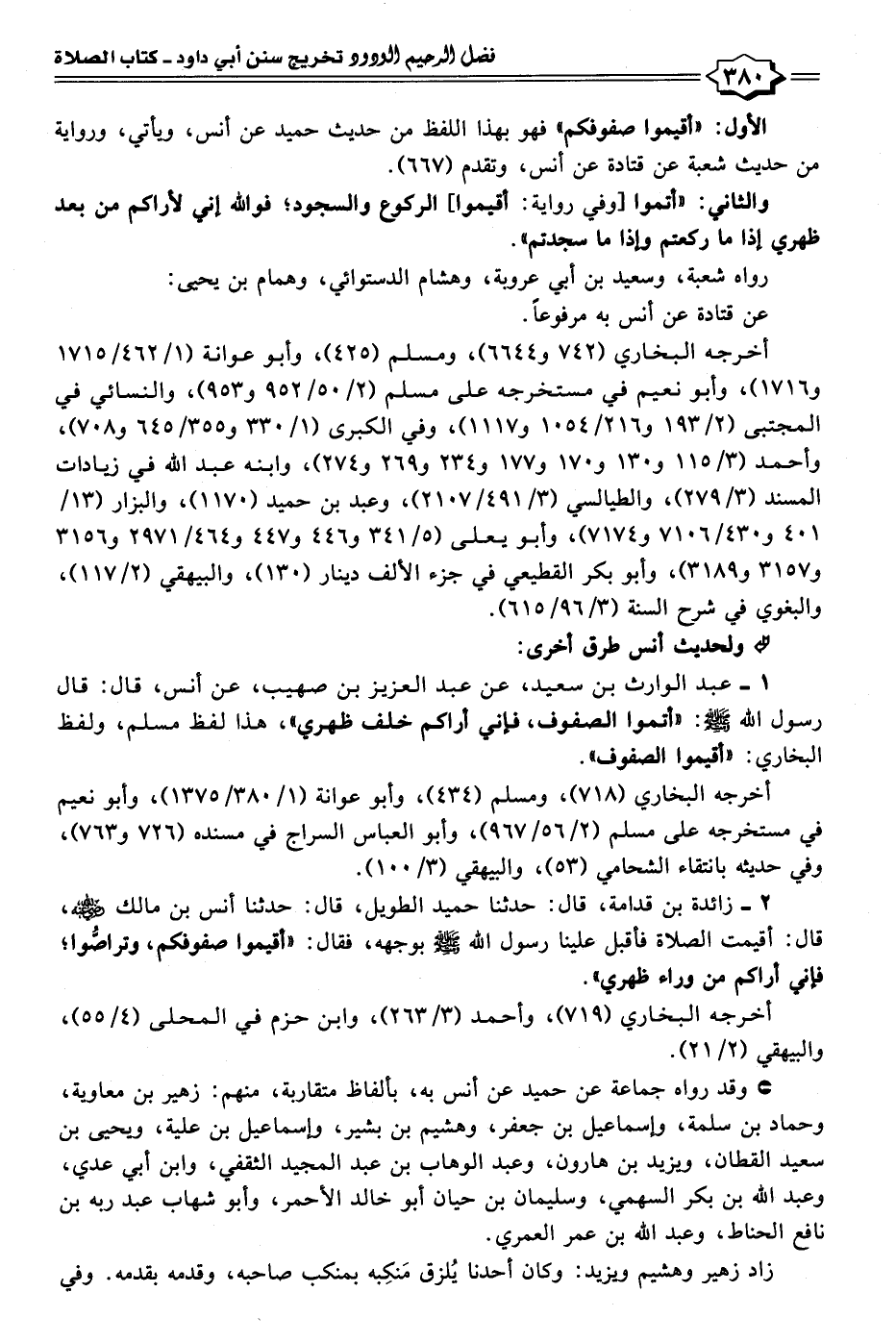 ٢ - زائدة بن قدامة، قال: حدثنا حميد الطويل، قال: حدثنا أَنس بن مالك - رضي الله عنه -، قال: أقيمت الصلاة فأقبل علينا رسول الله - صلى الله عليه وسلم - بوجهه، فقال: "أقيموا صفوفكم، وتراصُّوا؛ فإني أراكم من وراء ظهري".