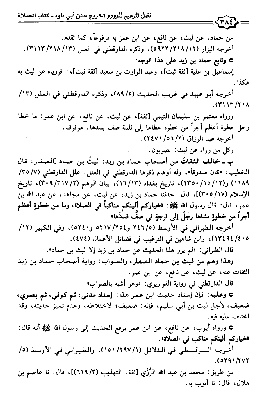 ورواه معتمر بن سليمان التيمي [ثقة]، عن ليث، عن نافع، عن ابن عمر: ما خطأ رجل خطوة أعظم أجرًا من خطوة أخطأها إلى ثلمة صف يسدها. موقوف.