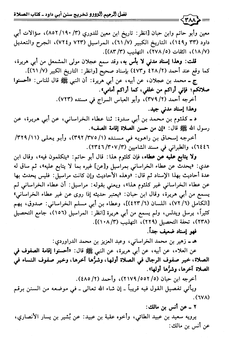 عن العلاء، عن أبيه، عن أبي هريرة، عن النبي - صلى الله عليه وسلم - قال: "أحسنوا إقامة الصفوف في الصلاة، خير صفوف الرجال في الصلاة أولها، وشرُّها آخرها، وخير صفوف النساء في الصلاة آخرها، وشرُّها أولها".