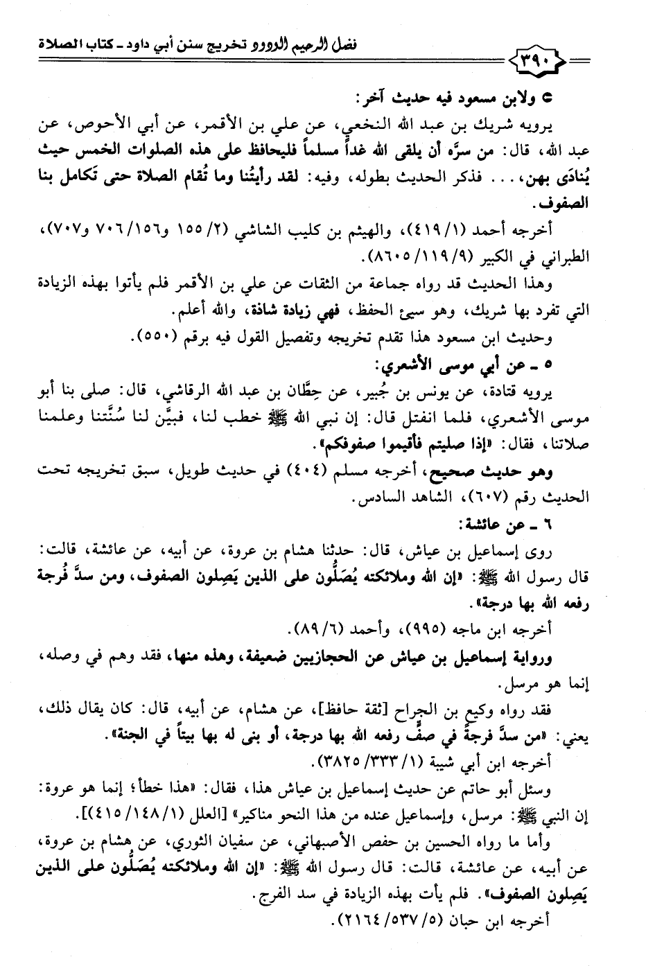 وأما ما رواه الحسين بن حفص الأصبهاني، عن سفيان الثوري، عن هشام بن عروة، عن أبيه، عن عائشة، قالت: قال رسول الله - صلى الله عليه وسلم -: "إن الله وملائكته يُصَلُّون على الذين يَصِلون الصفوف". فلم يأت بهذه الزيادة في سد الفرج.