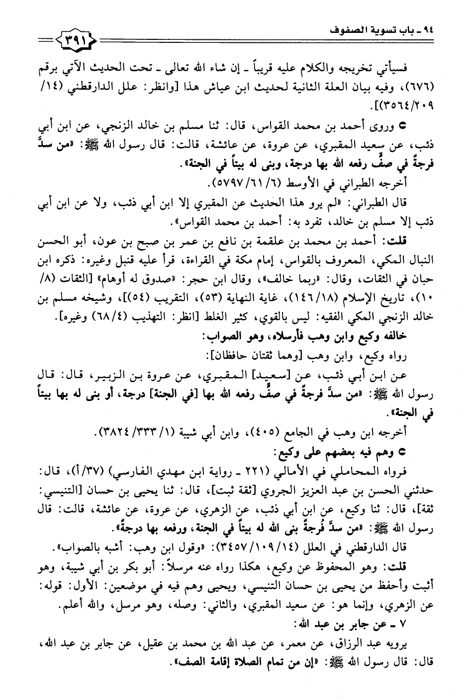 • وروى أحمد بن محمد القواس، قال: ثنا مسلم بن خالد الزنجي، عن ابن أبي ذئب، عن سعيد المقبري، عن عروة، عن عائشة، قالت: قال رسول الله - صلى الله عليه وسلم -: "من سدَّ فرجةً في صفٍّ رفعه الله بها درجة، وبنى له بيتًا في الجنّة".