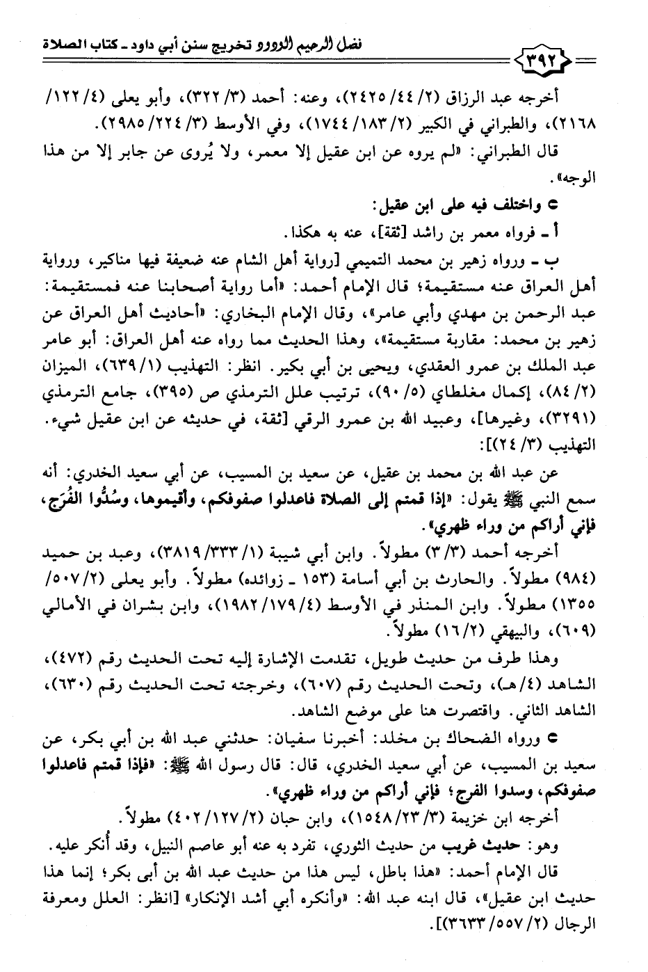 عن عبد الله بن محمد بن عقيل، عن سعيد بن المسيب، عن أبي سعيد الخدري: أنَّه سمع النبي - صلى الله عليه وسلم - يقول: "إذا قمتم إلى الصلاة فاعدلوا صفوفكم، وأقيموها، وسُدُّوا الفُرَج، فإني أراكم من وراء ظهري".
