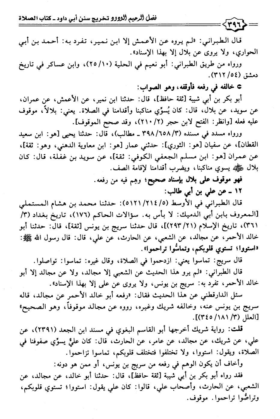 أبو بكر بن أبي شيبة [ثقة حافظ]، قال: حدثنا ابن نمير، عن الأعمش، عن عمران، عن سويد، عن بلال، قال: كان يُسوِّي مناكبنا وأقدامنا في الصلاة. يعني: بلالًا، موقوف عليه فعله [وانظر: الفتح لابن حجر (٢/ ٢١٠)، وقد صحح الموقوف].
