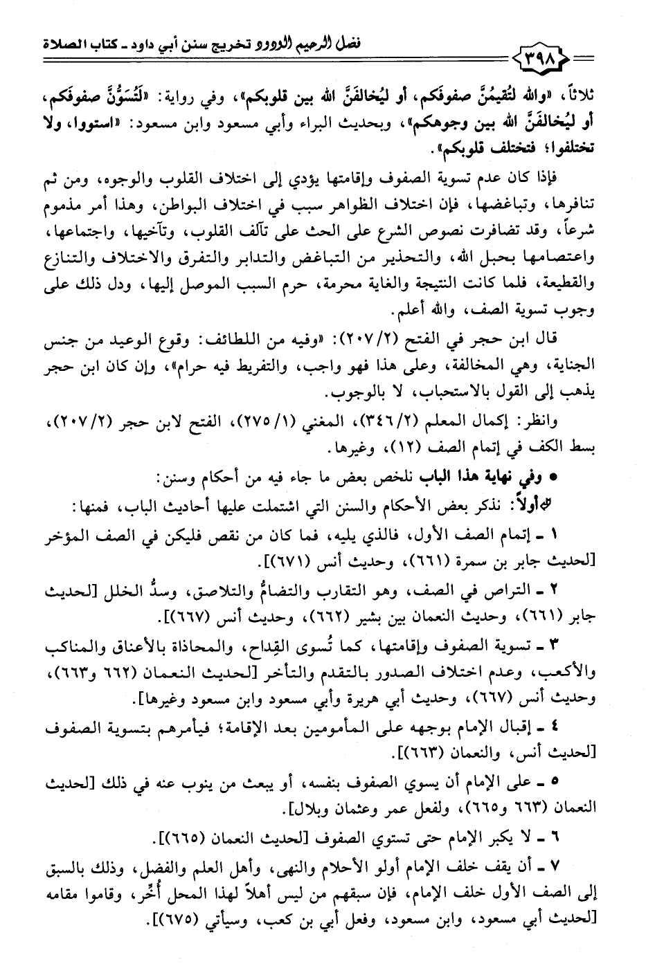 ٣ - تسوية الصفوف وإقامتها، كما تُسوى القِداح، والمحاذاة بالأعناق والمناكب والأكعب، وعدم اختلاف الصدور بالتقدم والتأخر [لحديث النعمان (٦٦٢ و ٦٦٣)، وحديث أَنس (٦٦٧)، وحديث أبي هريرة وأبي مسعود وابن مسعود وغيرها].