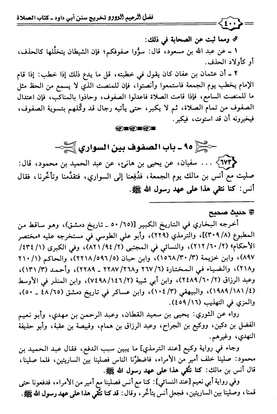 ١ - عن عبد الله بن مسعود، قال: سوُّوا صفوفكم؛ فإن الشيطان يتخلَّلها كالحذف، أو كأولاد الحذف.