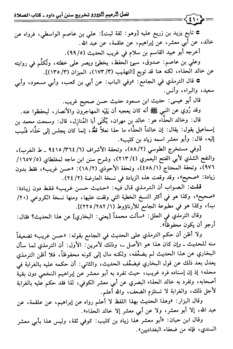 ولا أظن أن حكم الترمذي على الحديث في الجامع بقوله: "حسن غريب" تضعيفًا منه للحديث - وإن كان هذا هو الأصل -، وذلك لأمرين: الأول: أن الترمذي لما سأل البخاري عن هذا الحديث لم يضعِّفه، ولكنه مال إلى كونه محفوظًا، فلا أظن الترمذي يعدل بعد ذلك عن قول البخاري فيضعِّف الحديث، والثاني: أن حكمه عليه بالغرابة في محله؛ إذ إن إسناده فرد غريب، حيث تفرد به أبو معشر عن إبراهيم النخعي دون بقية أصحابه، وتفرد به خالد الحذاء البصري عن أبي معشر الكوفي، لذا فقد حكم عليه بالغرابة لأجل ذلك، والغرابة لا تستلزم الضعف، والله أعلم.