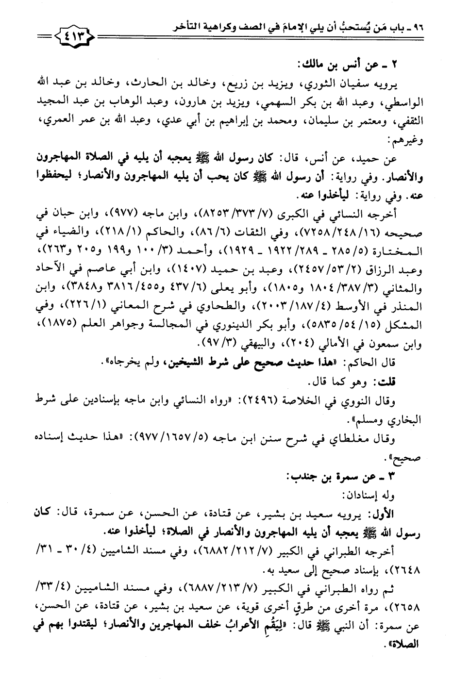 عن حميد، عن أَنس، قال: كان رسول الله - صلى الله عليه وسلم - يعجبه أن يليه في الصلاة المهاجرون والأنصار. وفي رواية: أن رسول الله - صلى الله عليه وسلم - كان يحب أن يليه المهاجرون والأنصار؛ ليحفظوا عنه. وفي رواية: ليأخذوا عنه.