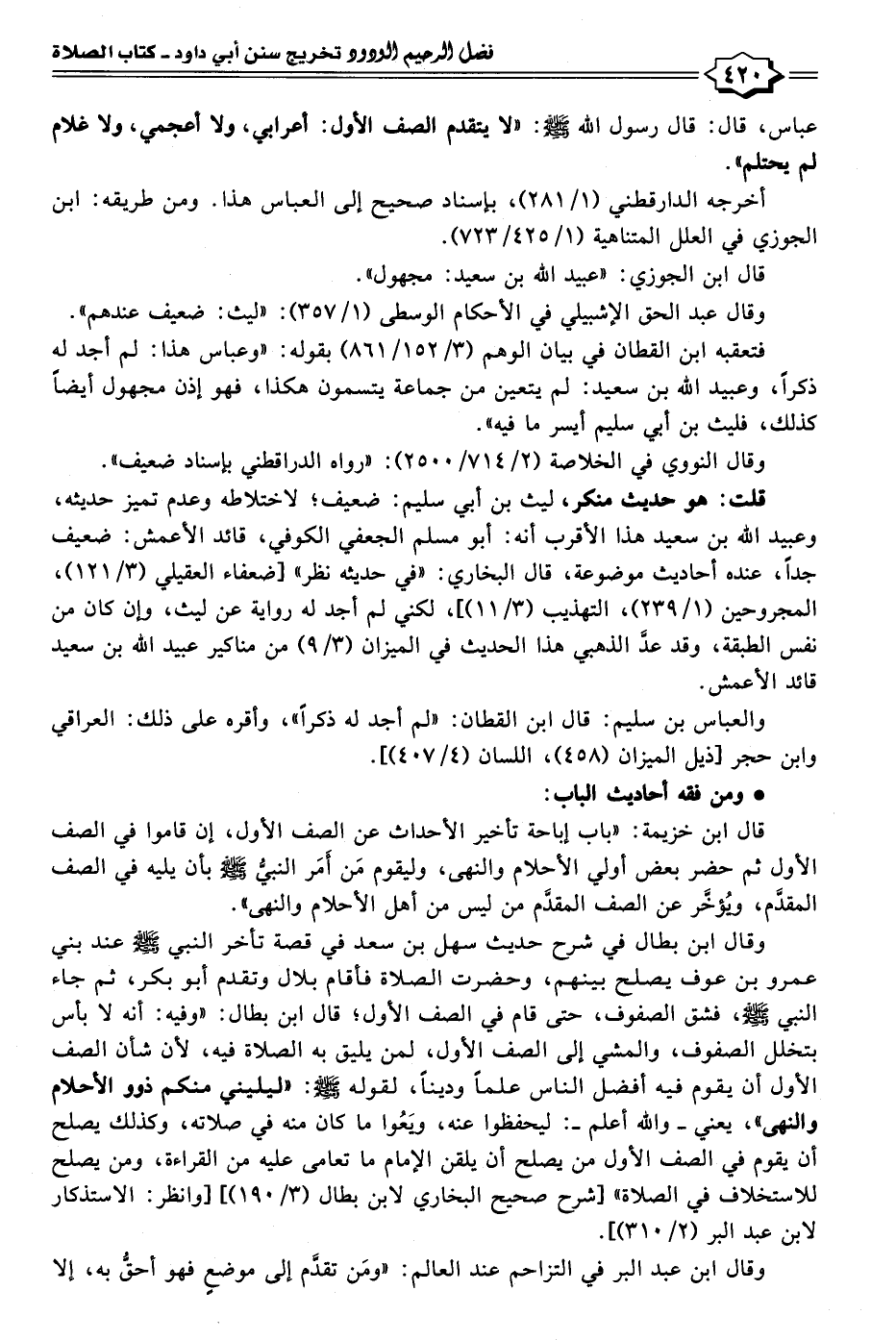 عباس، قال: قال رسول الله - صلى الله عليه وسلم -: "لا يتقدم الصف الأول: أعرابي، ولا أعجمي، ولا غلام لم يحتلم].