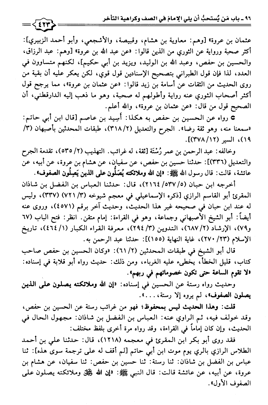 وخالفه: عبد الرحمن بن عمر رُسْتَة [ثقة، له غرائب. التهذيب (٢/ ٥٣٥)، تقدمة الجرح والتعديل (٣٣٦)]: حدثنا حسين بن حفص، عن سفيان، عن هشام بن عروة، عن أبيه، عن عائشة، قالت: قال رسول الله - صلى الله عليه وسلم -: "إن الله وملائكته يُصَلُّون على الذين يَصِلُون الصفوف".