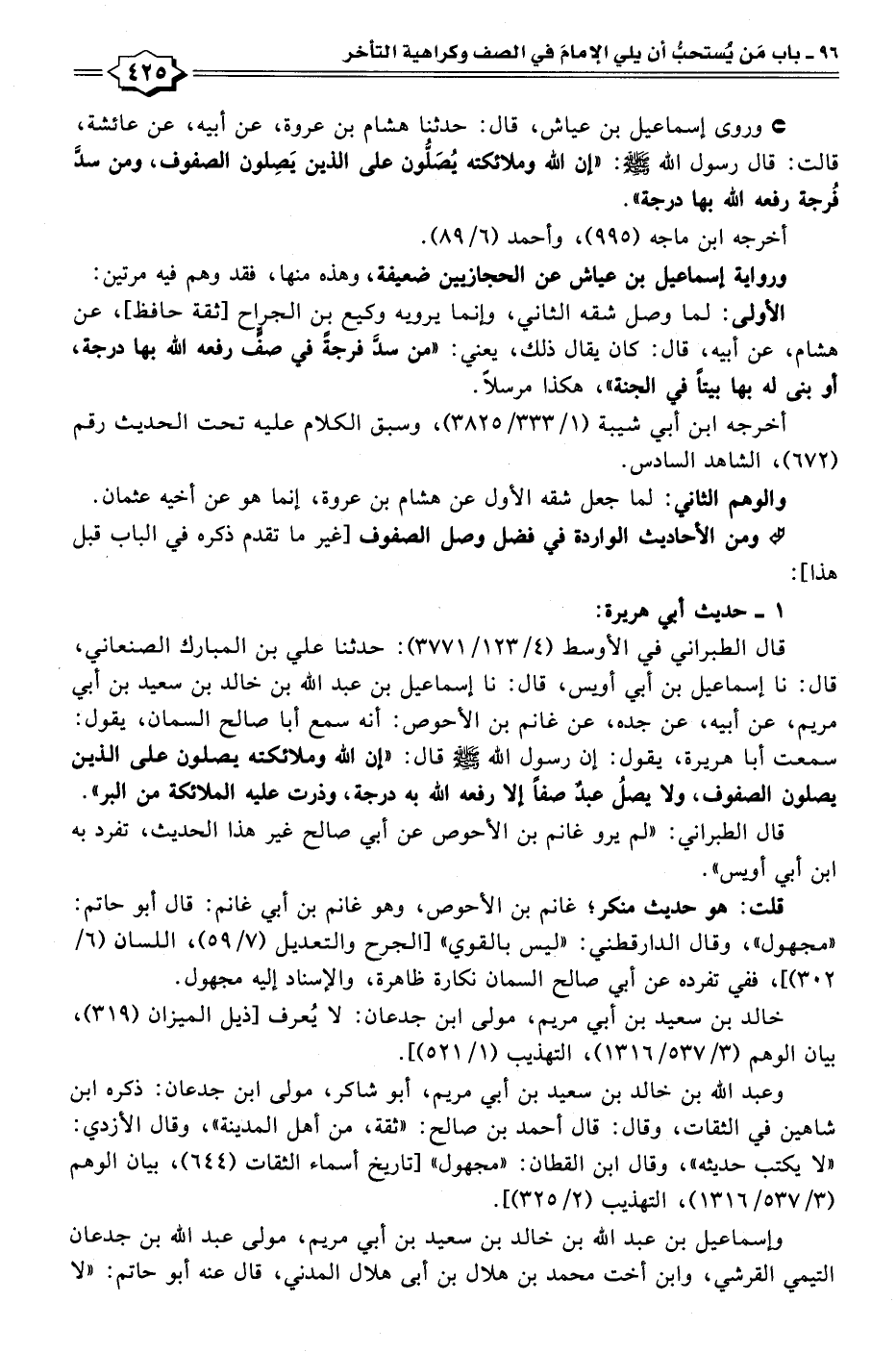 قال الطبراني في الأوسط (٤/ ١٢٣/ ٣٧٧١): حدثنا علي بن المبارك الصنعاني، قال: نا إسماعيل بن أبي أويس"، قال: نا إسماعيل بن عبد الله بن خالد بن سعيد بن أبي مريم، عن أبيه، عن جده، عن غانم بن الأحوص: أنَّه سمع أبا صالح السمان، يقول: سمعت أبا هريرة، يقول: إن رسول الله - صلى الله عليه وسلم - قال: "إن الله وملائكته يصلون على الذين يصلون الصفوف، ولا يصلُ عبدٌ صفًّا إلا رفعه الله به درجة، وذرت عليه الملائكة من البر".