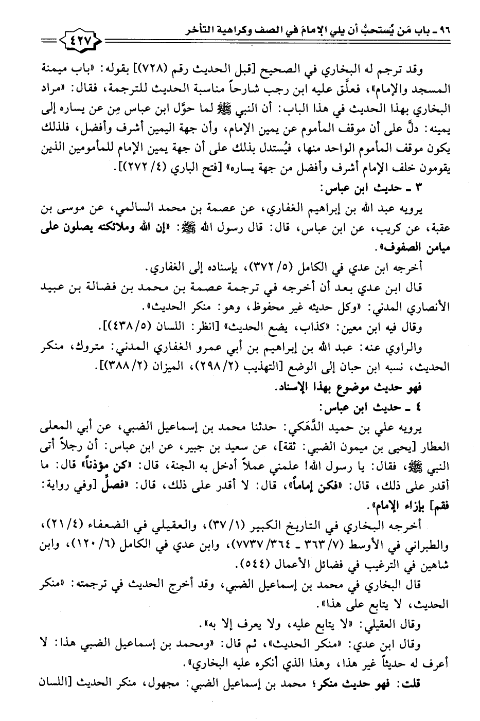 يرويه عبد الله بن إبراهيم الغفاري، عن عصمة بن محمد السالمي، عن موسى بن عقبة، عن كريب، عن ابن عباس، قال: قال رسول الله - صلى الله عليه وسلم -: "إن الله وملائكته يصلون على ميامن الصفوف".