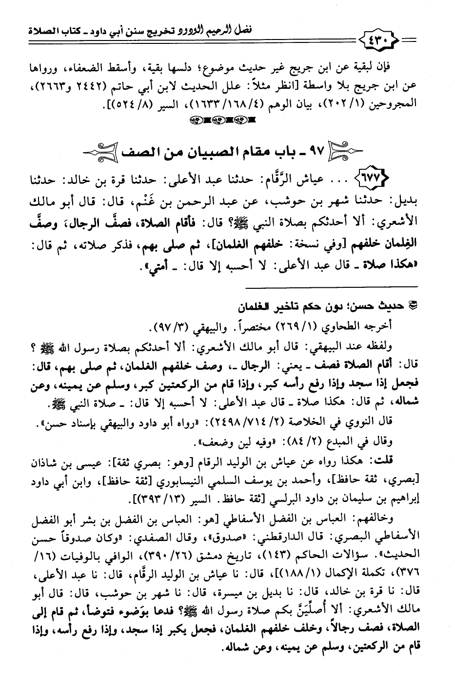 ٦٧٧ - . . . عياش الرَّقَّام: حدثنا عبد الأعلى: حدثنا قرة بن خالد: حدثنا بديل: حدثنا شهر بن حوشب، عن عبد الرحمن بن غَنْم، قال: قال أبو مالك الأشعري: ألا أحدثكم بصلاة النبي - صلى الله عليه وسلم -؟ قال: فأقام الصلاة، فصفَّ الرجالَ، وصفَّ الغِلمان خلفهم [وفي نسخة: خلفهم الغلمان]، ثم صلى بهم، فذكر صلاته، ثم قال: "هكذا صلاة -قال عبد الأعلى: لا أحسبه إلا قال:- أمتي".