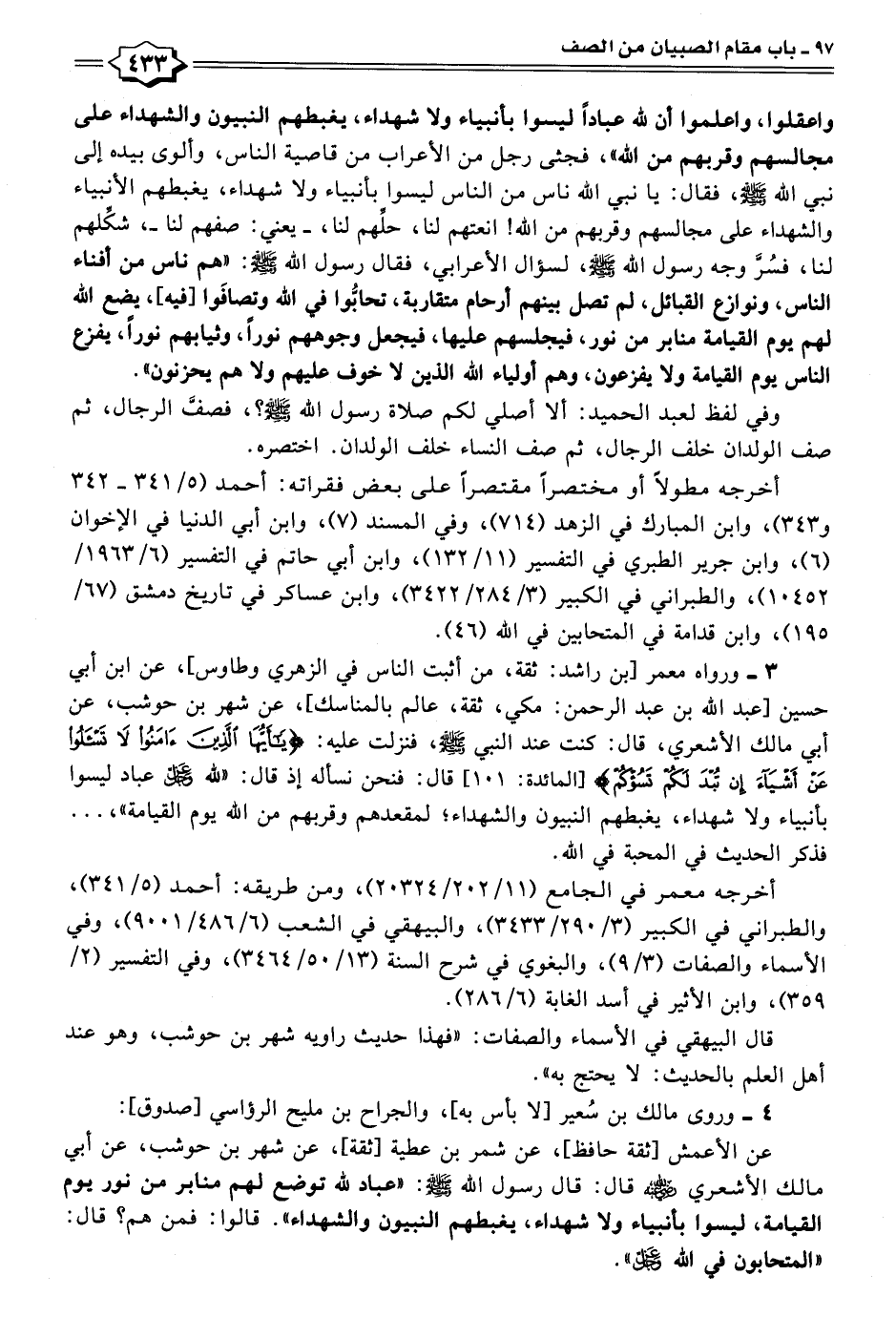 عن الأعمش [ثقة حافظ]، عن شمر بن عطية [ثقة]، عن شهر بن حوشب، عن أبي مالك الأشعري - رضي الله عنه - قال: قال رسول الله - صلى الله عليه وسلم -: "عباد لله توضع لهم منابر من نور يوم القيامة، ليسوا بأنبياء ولا شهداء، يغبطهم النبيون والشهداء". قالوا: فمن هم؟ قال: "المتحابون في الله عز وجل".