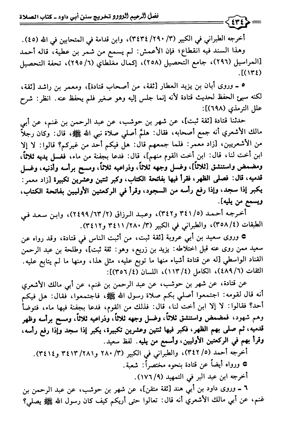 ٦ - وروى داود بن أبي هند [ثقة متقن]، عن شهر بن حوشب، عن عبد الرحمن بن غنم، عن أبي مالك الأشعري أنه قال: تعالوا حتى أريكم كيف كان رسول الله - صلى الله عليه وسلم - يصلي؟