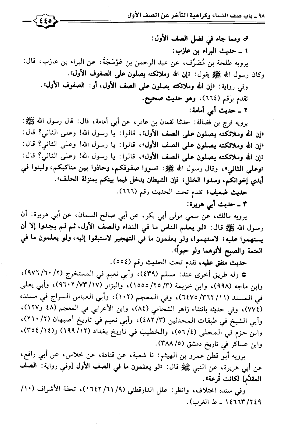 يرويه طلحة بن مُصَرِّف، عن عبد الرحمن بن عَوْسَجَةَ، عن البراء بن عازب، قال: وكان رسول الله - صلى الله عليه وسلم - يقول: "إن الله وملائكته يصلون على الصفوف الأول".