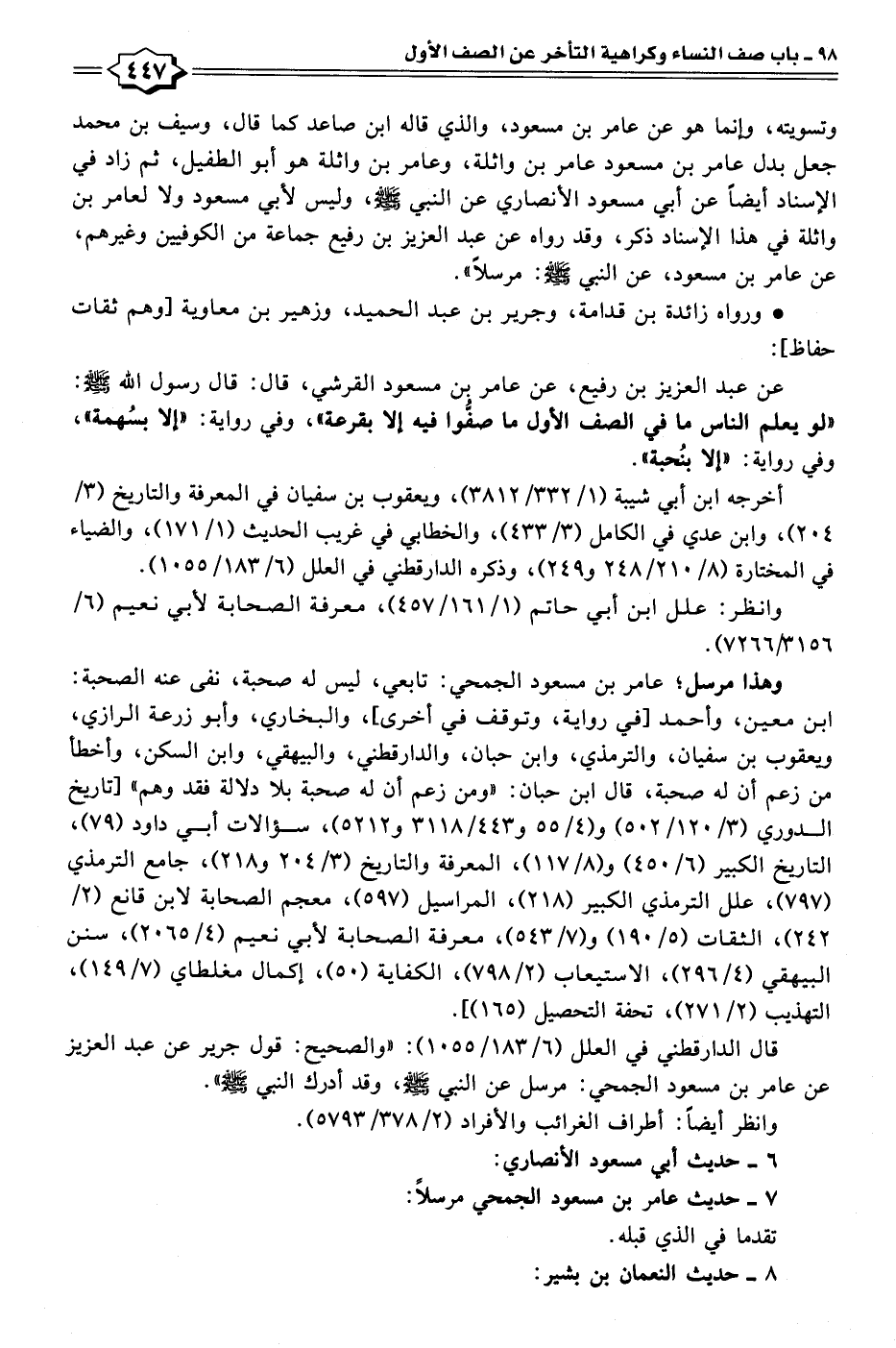 عن عبد العزيز بن رفيع، عن عامر بن مسعود القرشي، قال: قال رسول الله - صلى الله عليه وسلم -: "لو يعلم الناس ما في الصف الأول ما صفُّوا فيه إلا بقرعة"، وفي رواية: "إلا بسُهمة"، وفي رواية: "إلا بنُحبة".